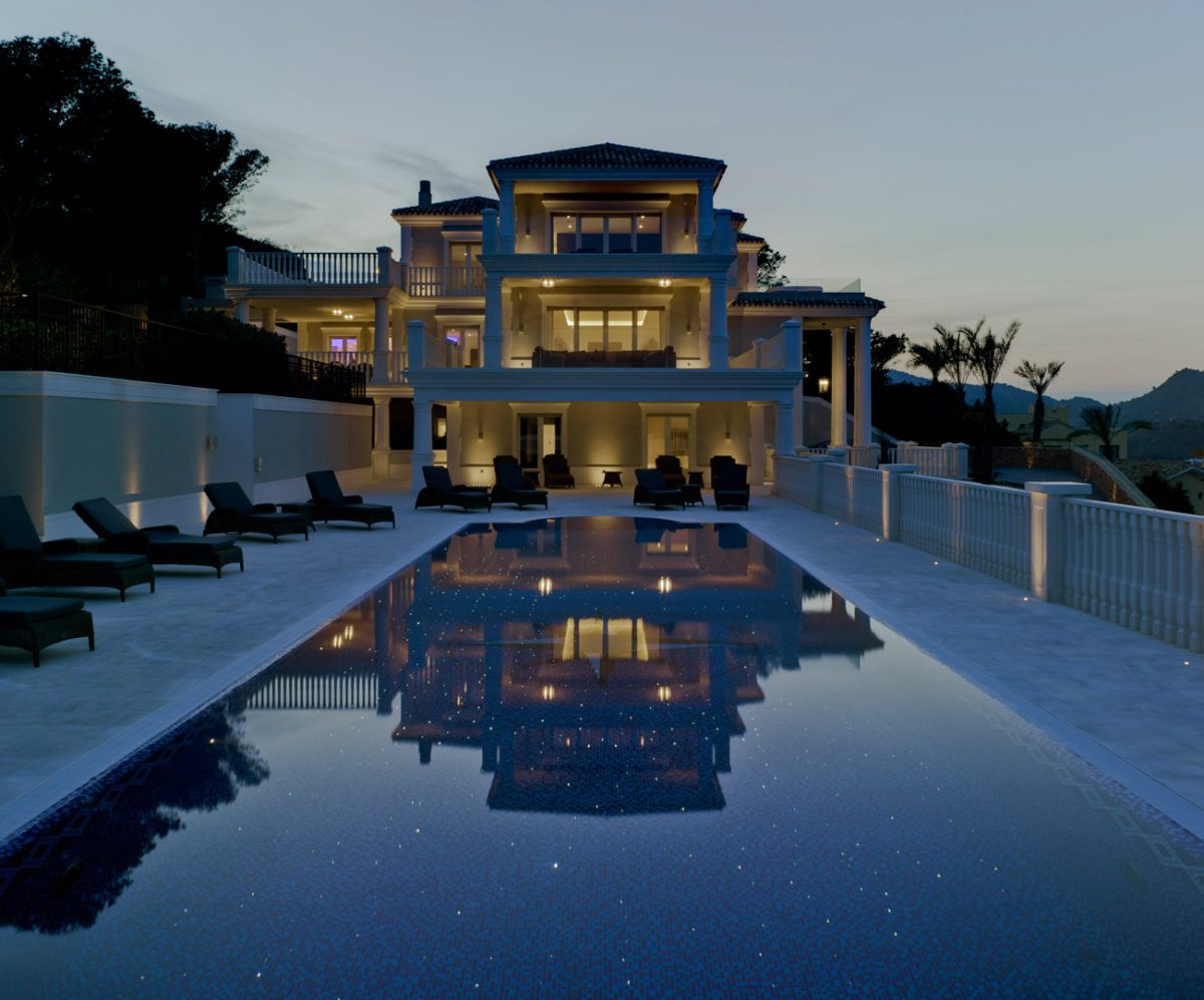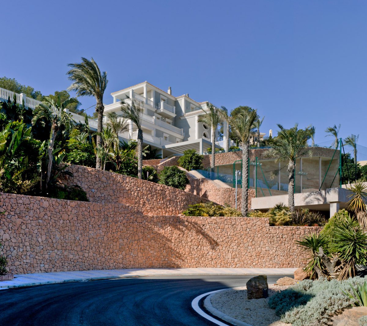 A sizeable kitchen situated in Spain. On either side of the large central kitchen island and Corian breakfast bar that easily seats eight is an array of contemporary handless furniture optimizing the space and light in this kitchen.