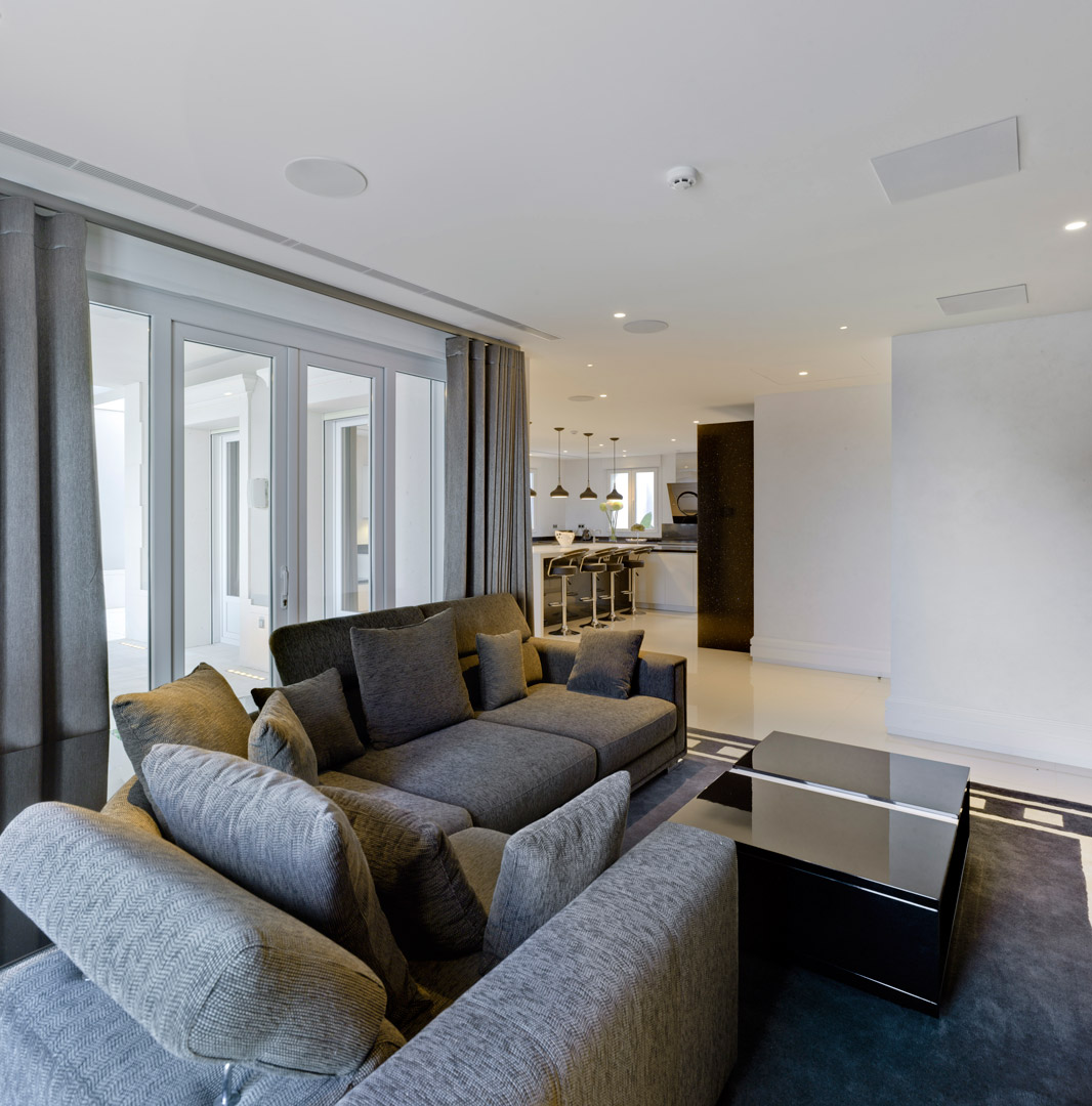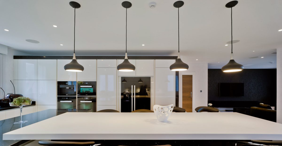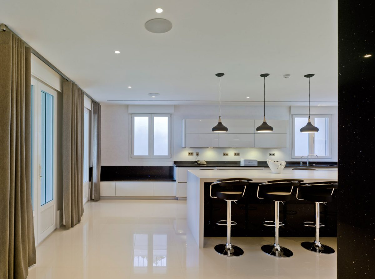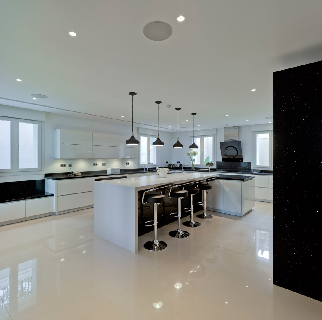 The black Silestone cladding around the glass white bank of units ties in with the large expanse of worktop in the same material, completing the whole look. Both the design and quality will stand the test of time.