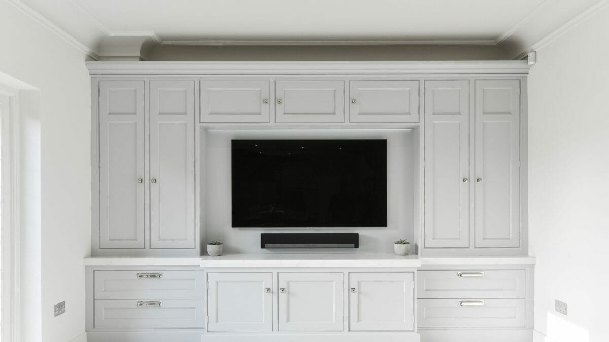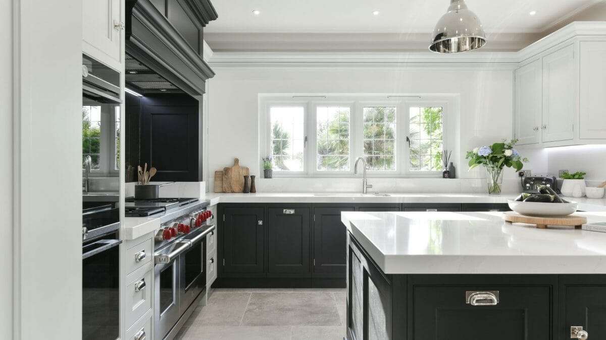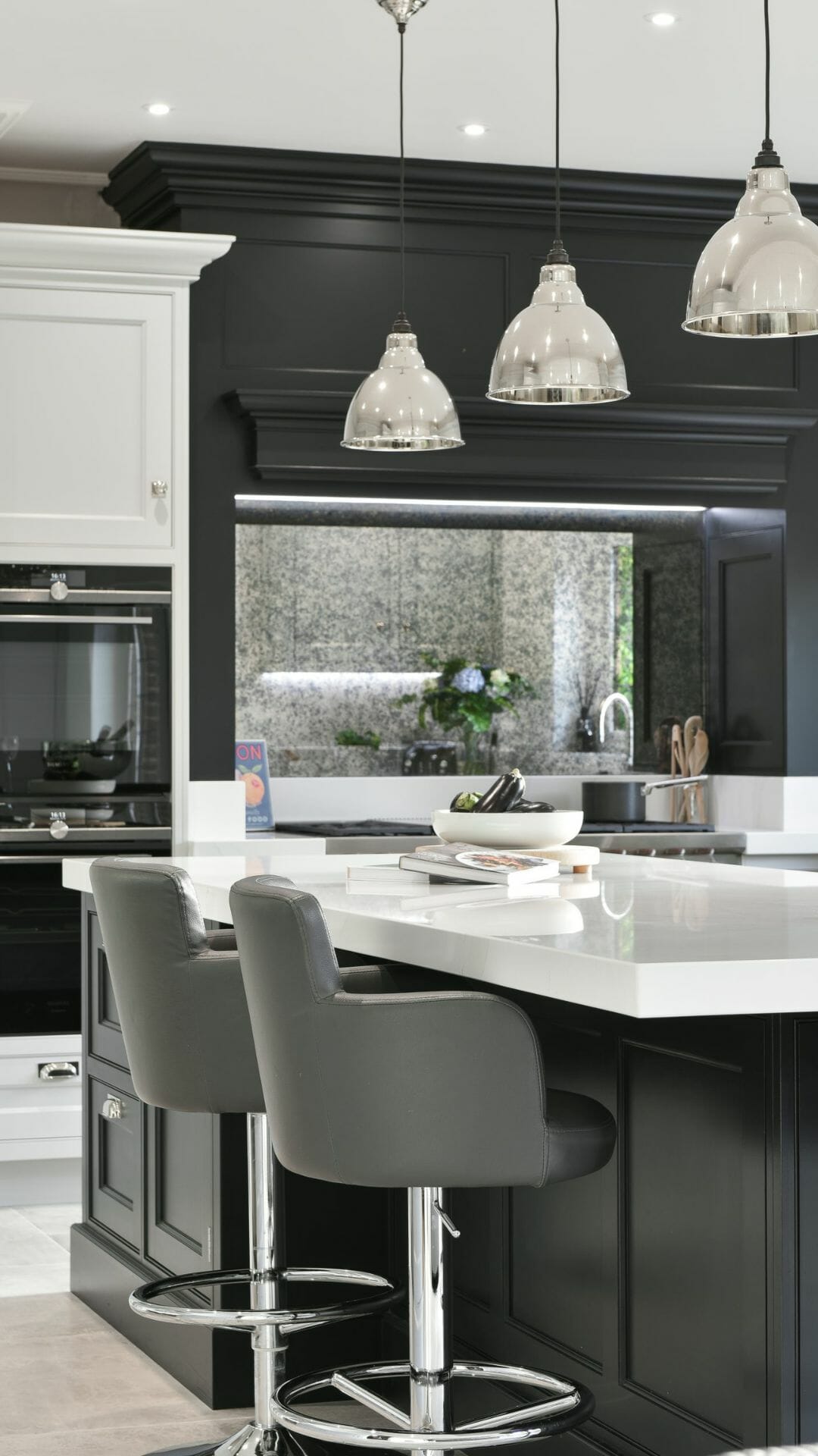 This was then mirrored in the utility, in the bespoke made-to-measure television storage, and in the storage cupboards and panelling running down the corridor to the conservatory. Keeping this panelling and all tall units light in colour maintained an open feel in the room. In contrast, the darker of colour in the base units and the bespoke feature range canopy – which was built to house large specialist extraction – adds drama and depth.