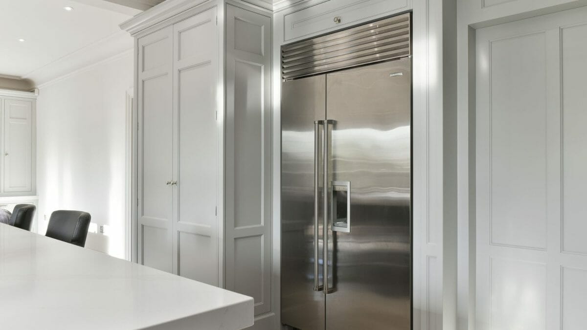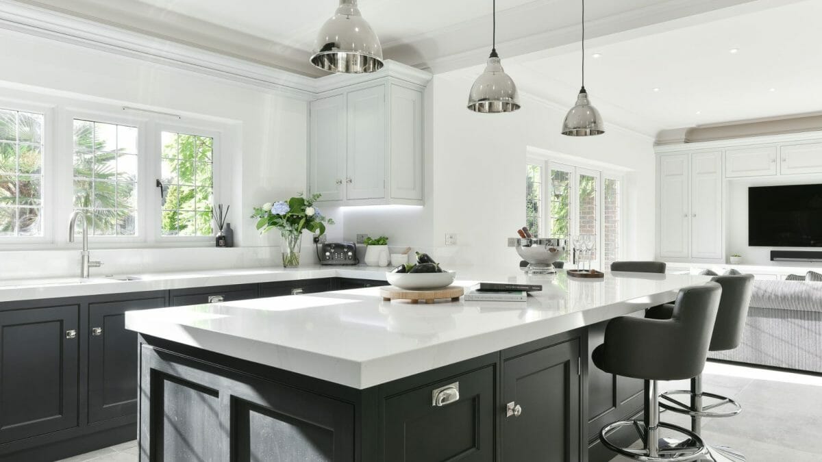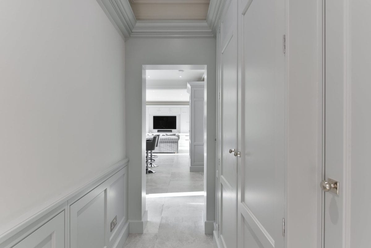This beautiful hand-painted in-frame kitchen was designed to create a unified look throughout multiple zones. The clients previously felt that the alcoves and multiple architectural doorways made the space feel disjointed, which they wanted to rectify with this renovation. We achieved a new unity throughout by matching the architectural doors to the kitchen and tailor-making shaker panelling and cornice to run around the room tying all zones together.