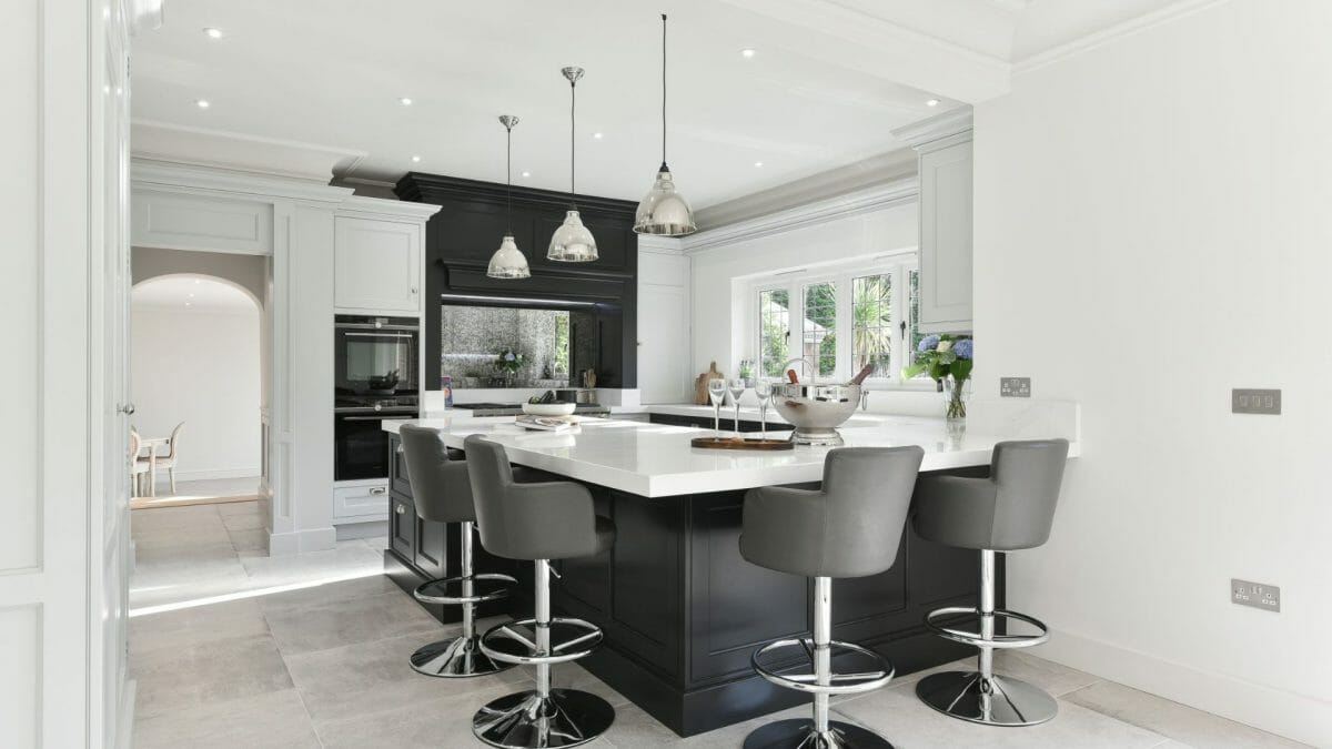 The large peninsula creates a beautiful expanse of the specialist 60mm Calacatta Gold quartz worktops whilst also providing essential seating space for the young family to gather. This kitchen includes: solid oak drawer boxes, Wolf range, Subzero fridge freezer, Siemens ovens, Quooker taps, bespoke canopy, worktop-mounted storage.