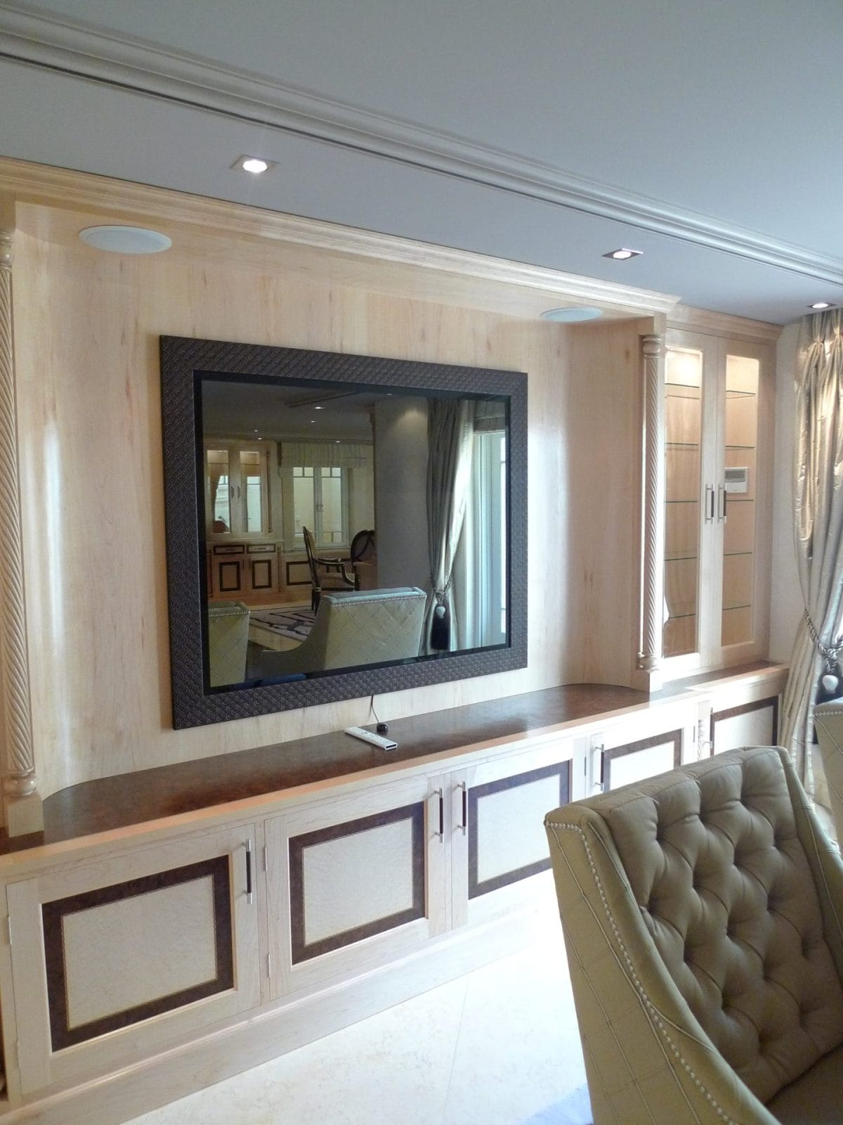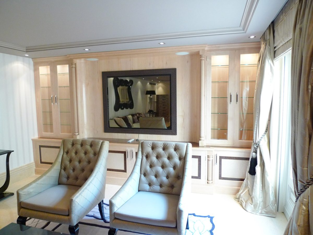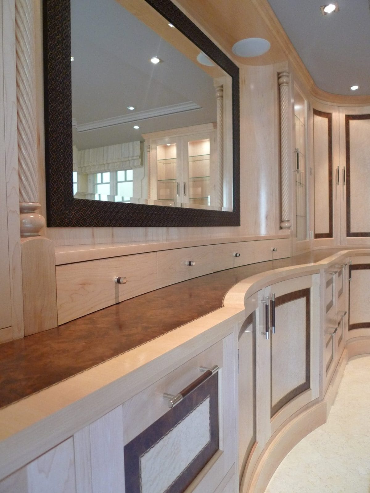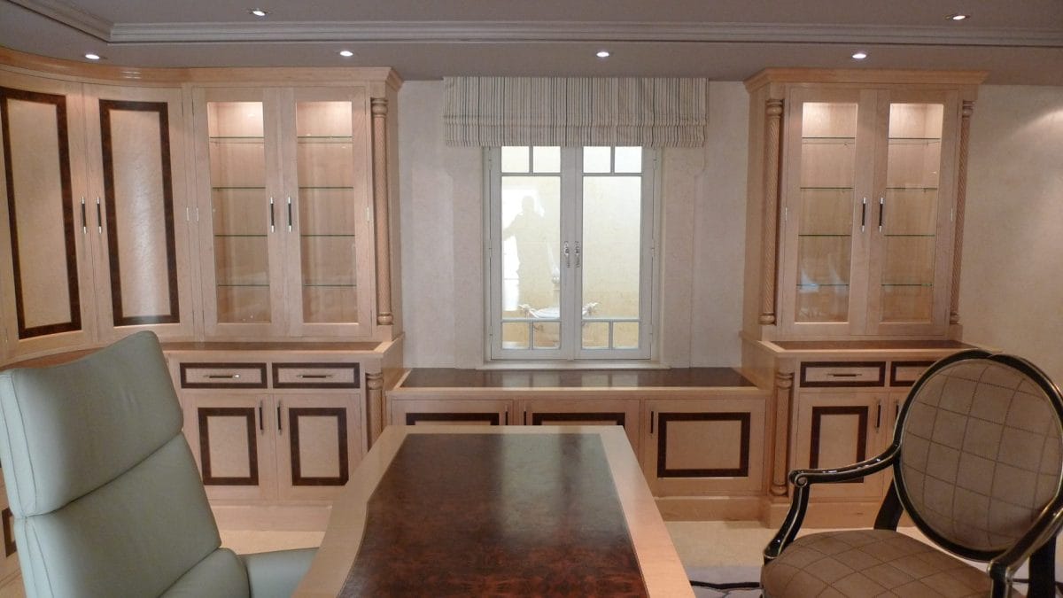 Designed specifically with the client and all details selected such as the curved drawers and display units, turnings on the fitted furniture and matching desk all the way through to the unique handles, solid maple plinth and cornice.