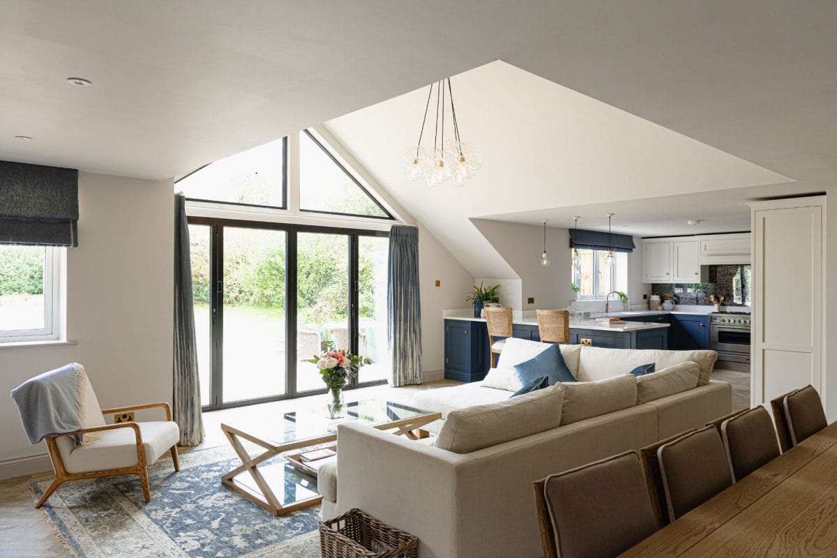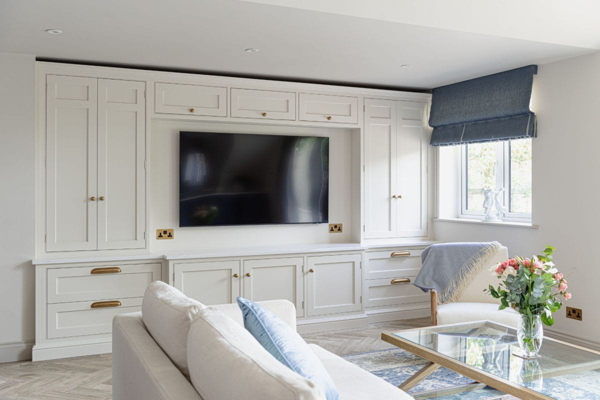 Bi-folding storage, integrated fridge and freezer and a dramatic antique mirror splashback complete this beautiful kitchen. The same cabinetry is then continued into the lounge with a large freestanding media unit which complements and balances the kitchen opposite.