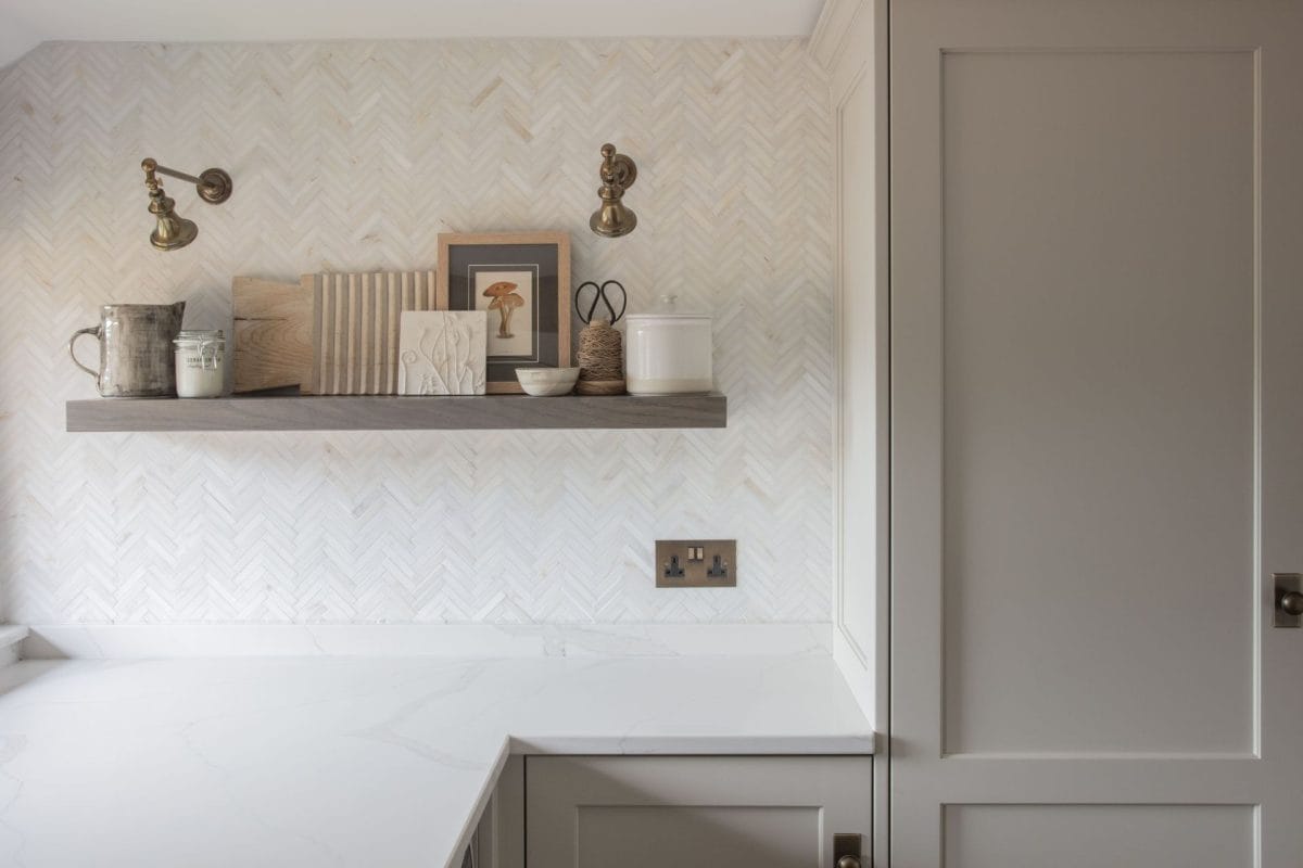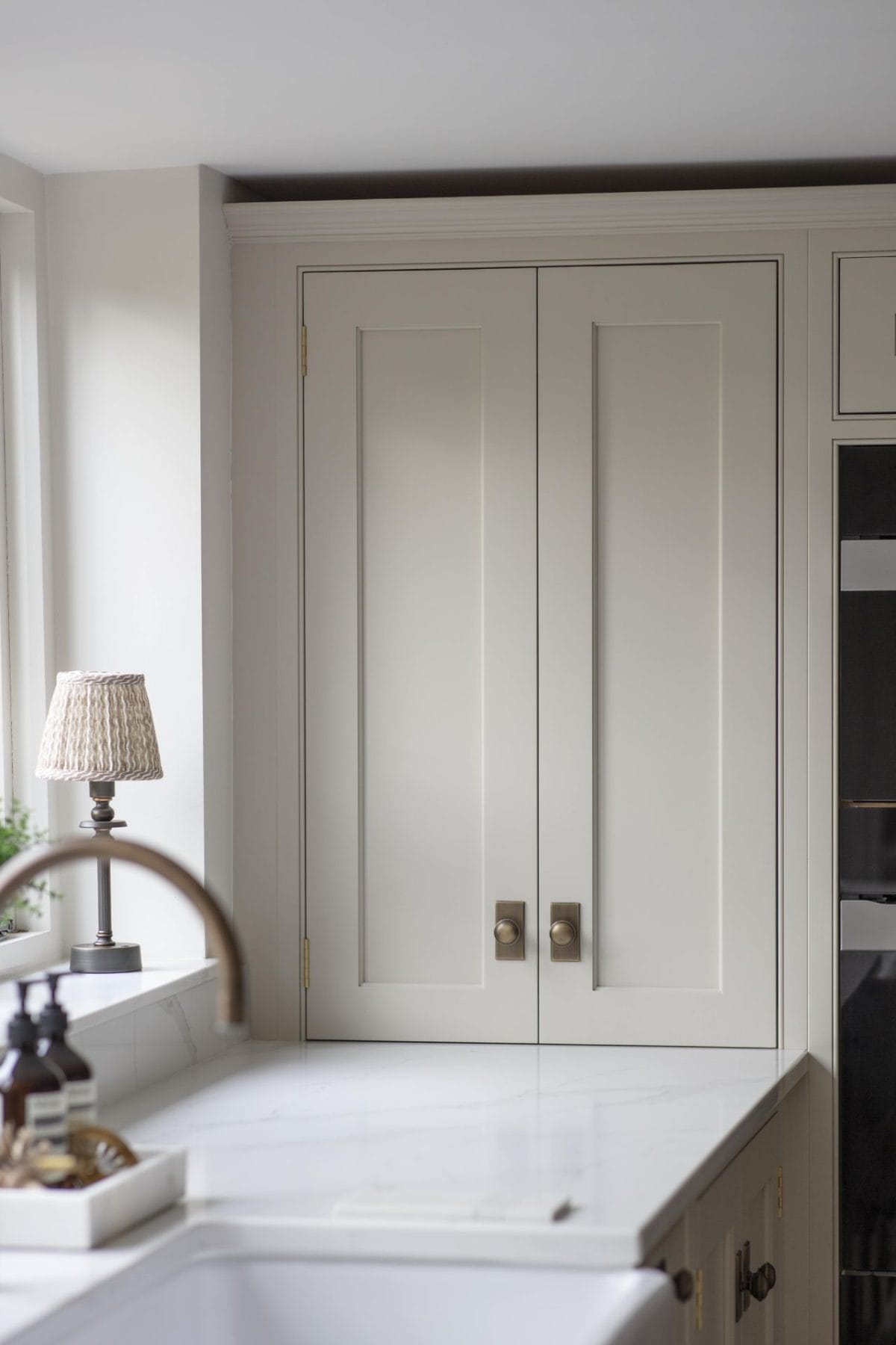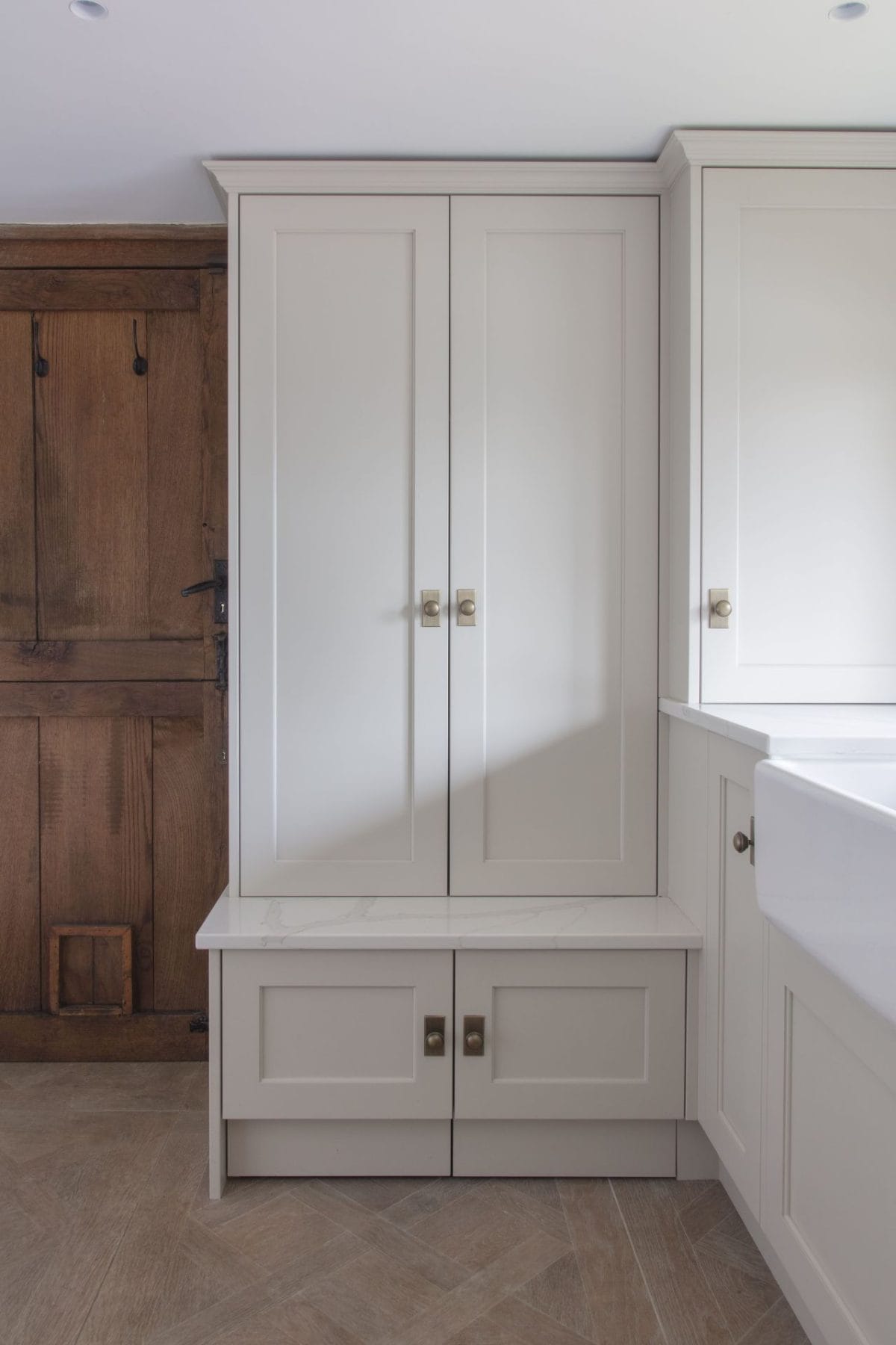 The stunning colour palette was inspired by natural materials, incorporating muted oatmeal and stone colours alongside burnished brass detailing. Stained oak veneer interiors enhance the bi-folding storage, bespoke larder and glazed dresser areas to give storage which is both practical and beautiful.