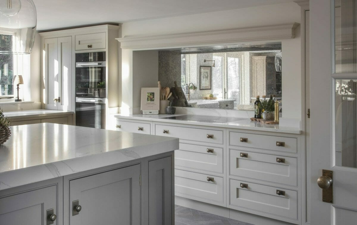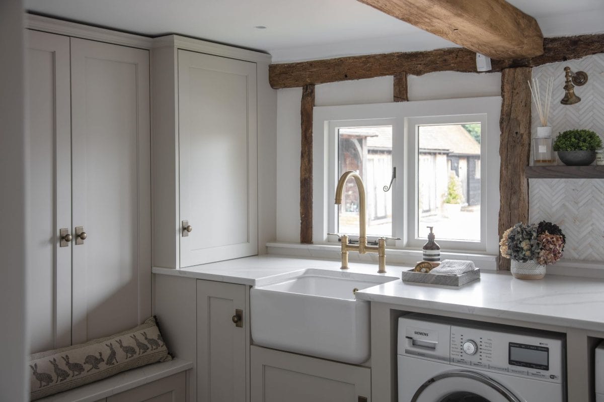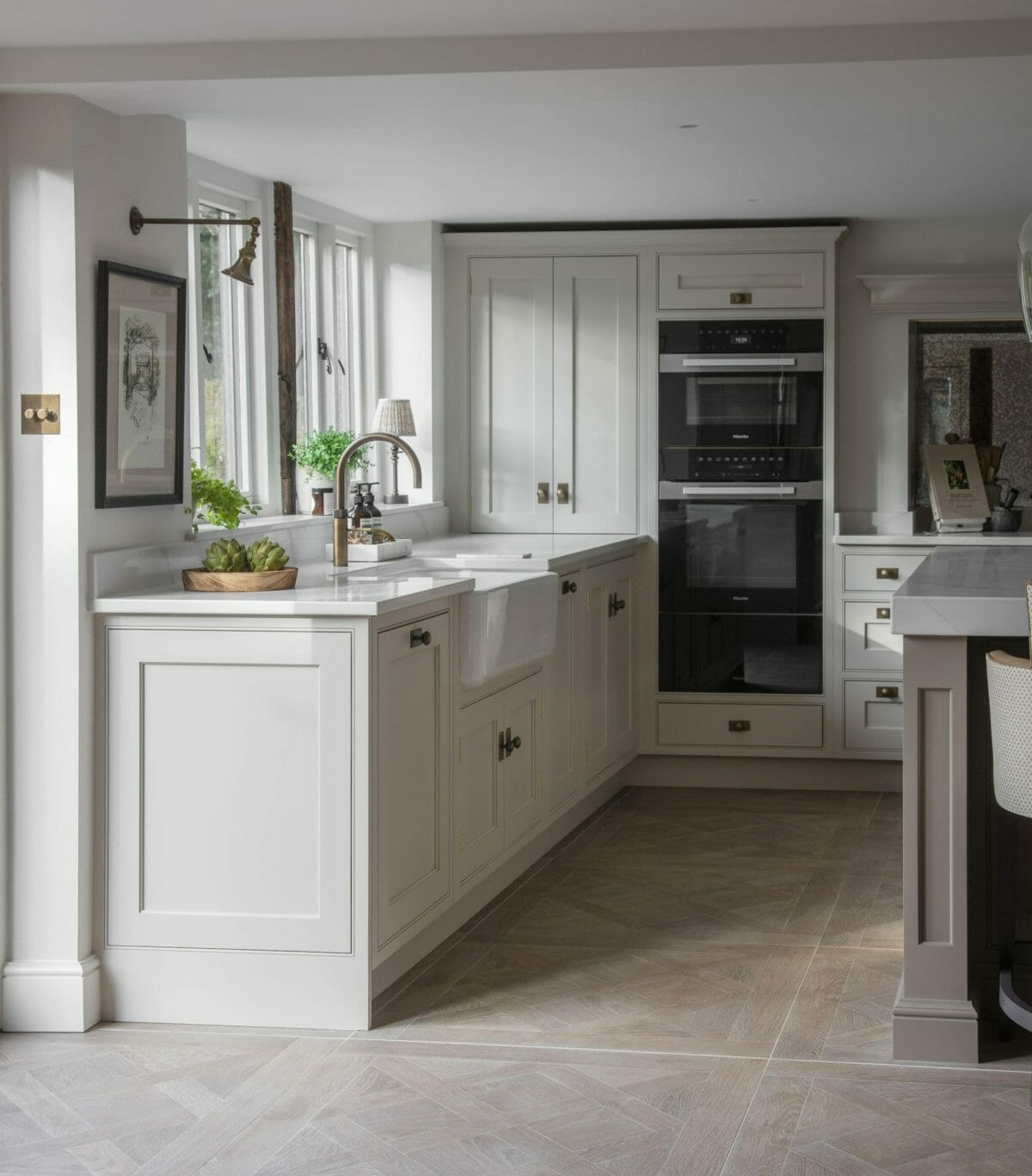The bespoke island features large amounts of drawer storage, pilaster-framed seating and a perfect square proportion to balance the room shape. Appliances are all integrated within the units including an extractor hidden in a discrete mantle with an antique mirror splashback. The kitchen then opens onto a complementary utility complete with boot and coat storage, hidden laundry and finished with herringbone tiles. The kitchen project is a lesson in craftsmanship and beautiful finishes.