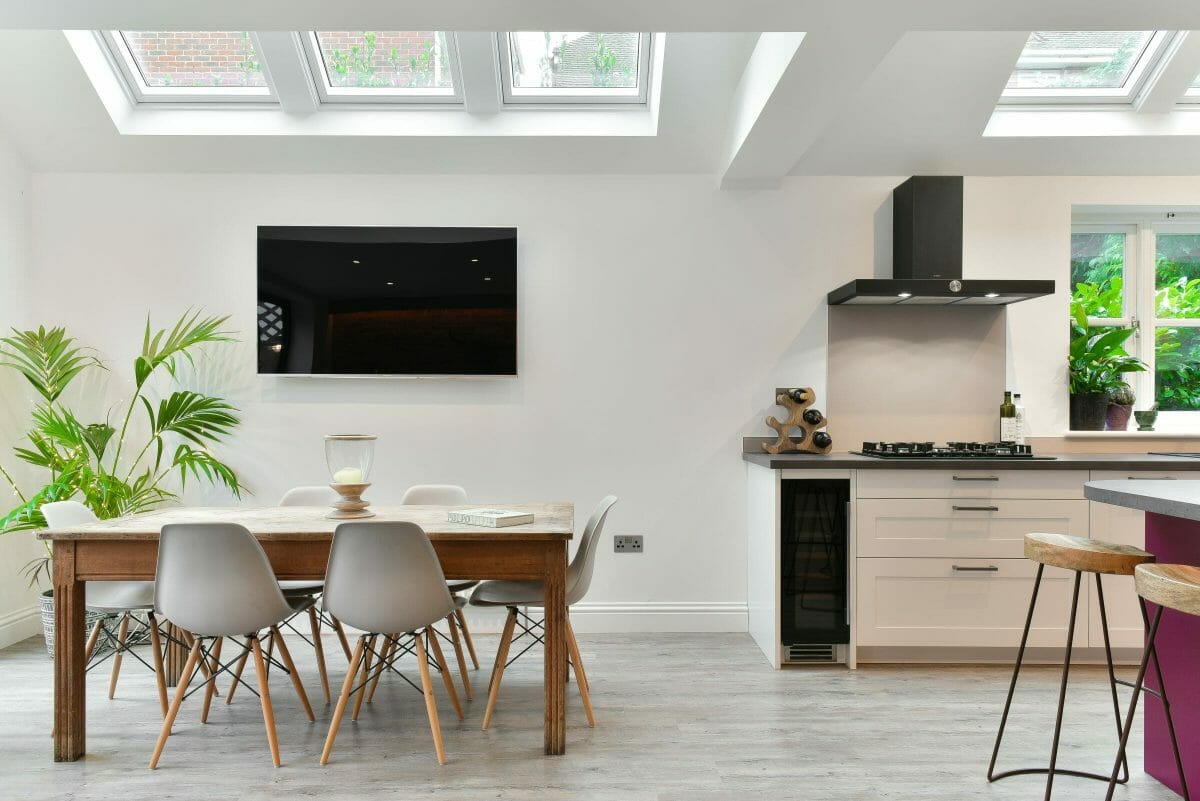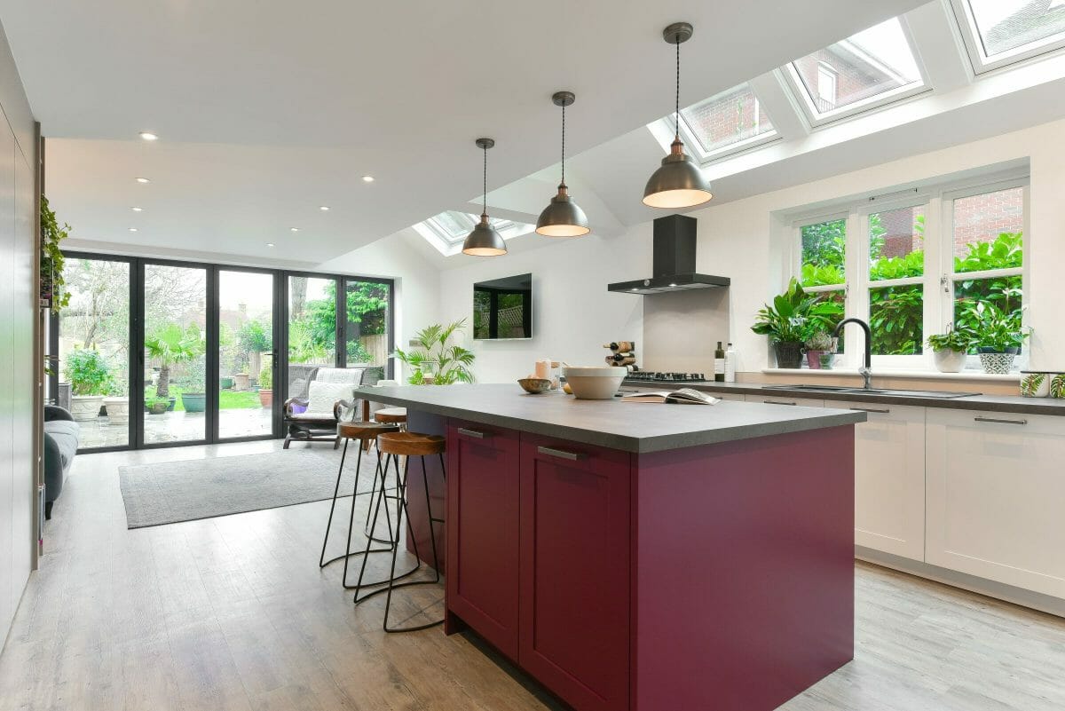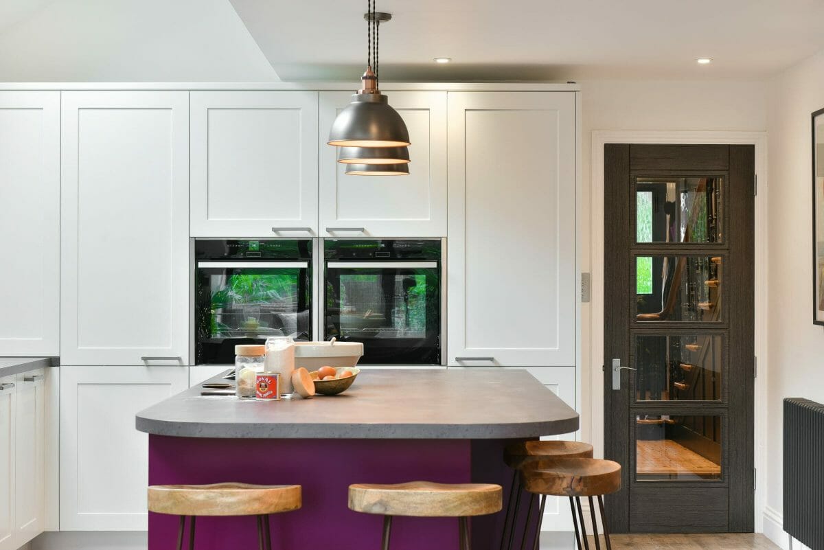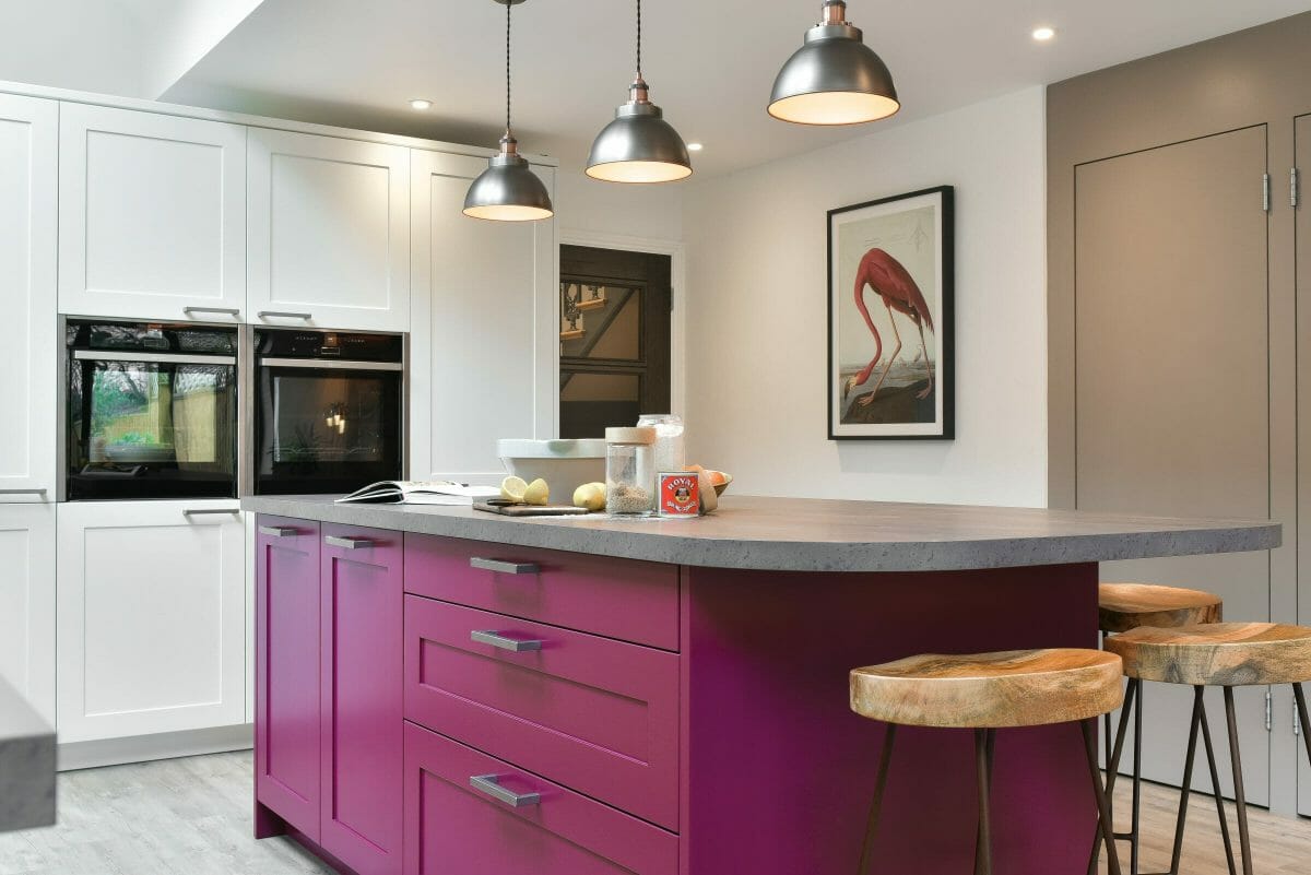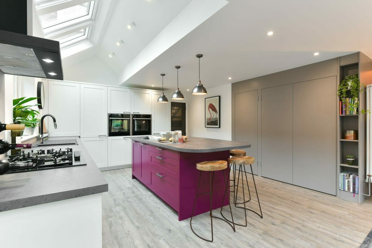 The island was colour matched to a bespoke vibrant plum colour, which was echoed in the client’s artwork and complemented by other furniture in the room. The kitchen includes Neff appliances, a black Elica extractor and a black sink & tap; a laminate worktop and lacquered.