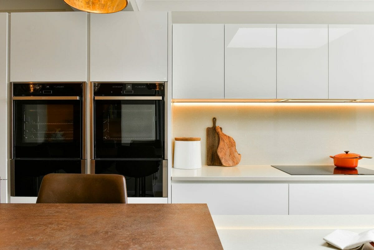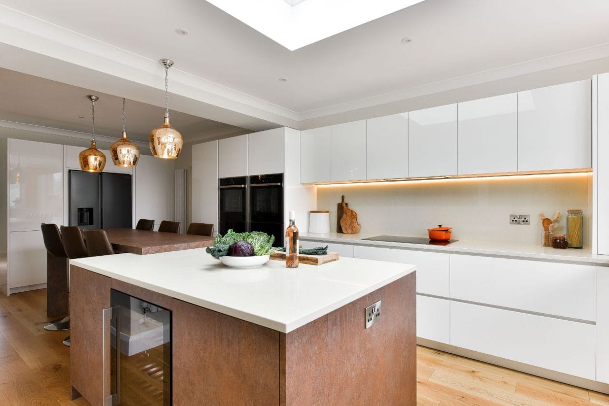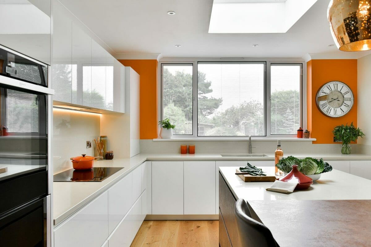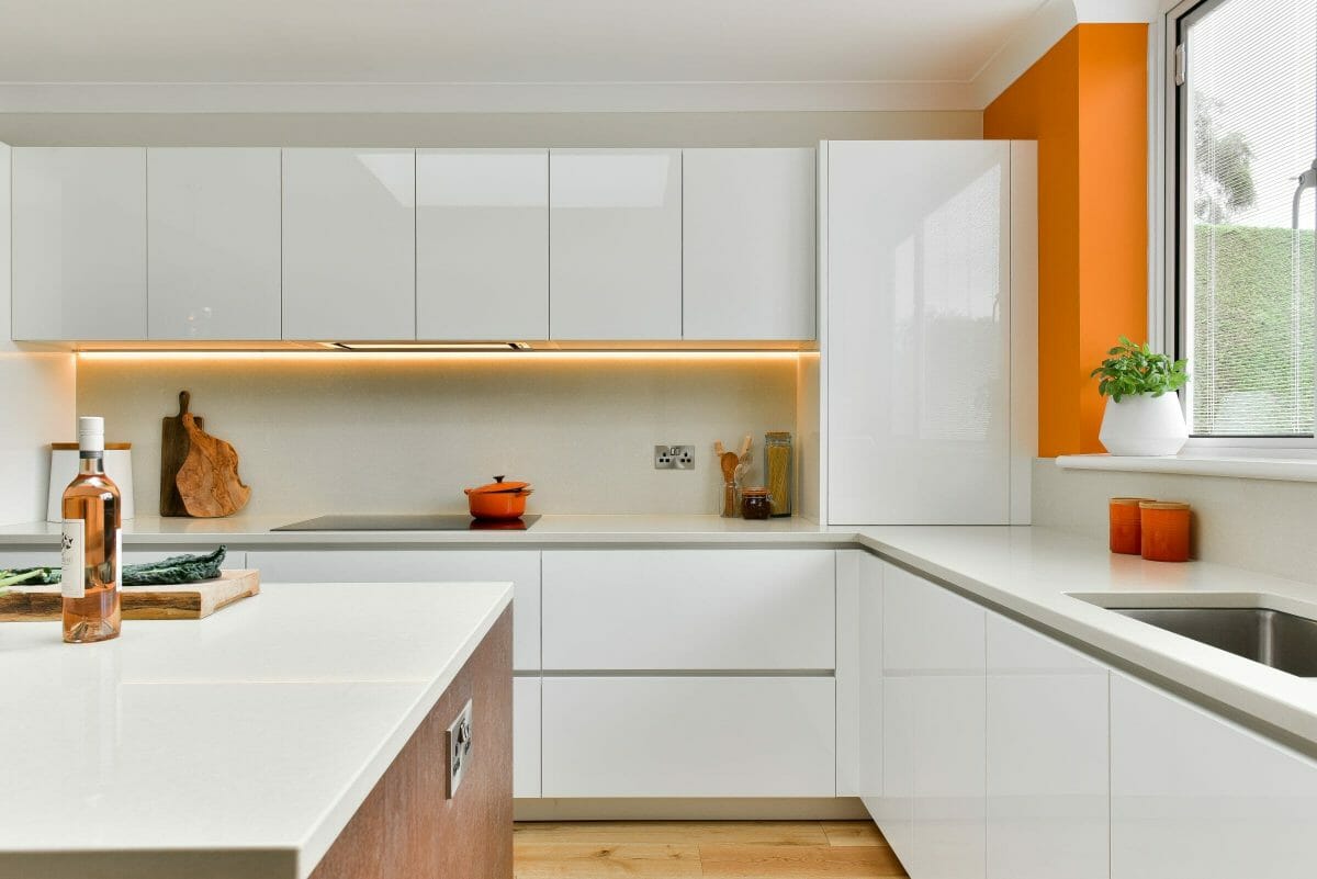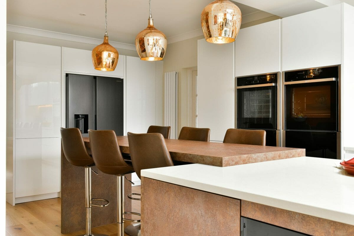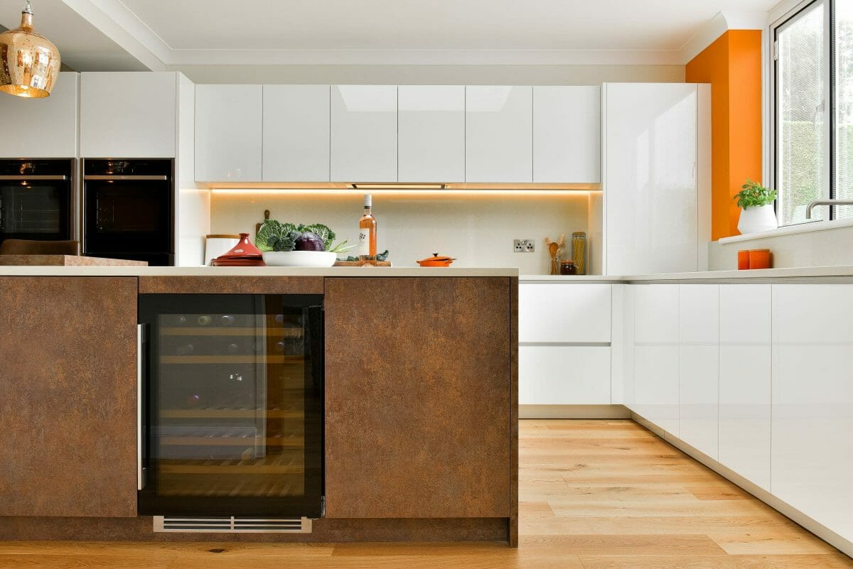 High gloss and textured Ferro Bronze laminate doors are combined here with splashes of orange for a bright contemporary handleless kitchen. This kitchen was designed as part of an extension project and it was very important for the client that the full length of the room was utilised including a large island with stool seating for 6 to act as an informal dining space. Matching the textured doors on the island we, therefore, created a self-supporting table feature which creates a stunning focal point in the middle of the room and is loved by the clients and their grandchildren alike!