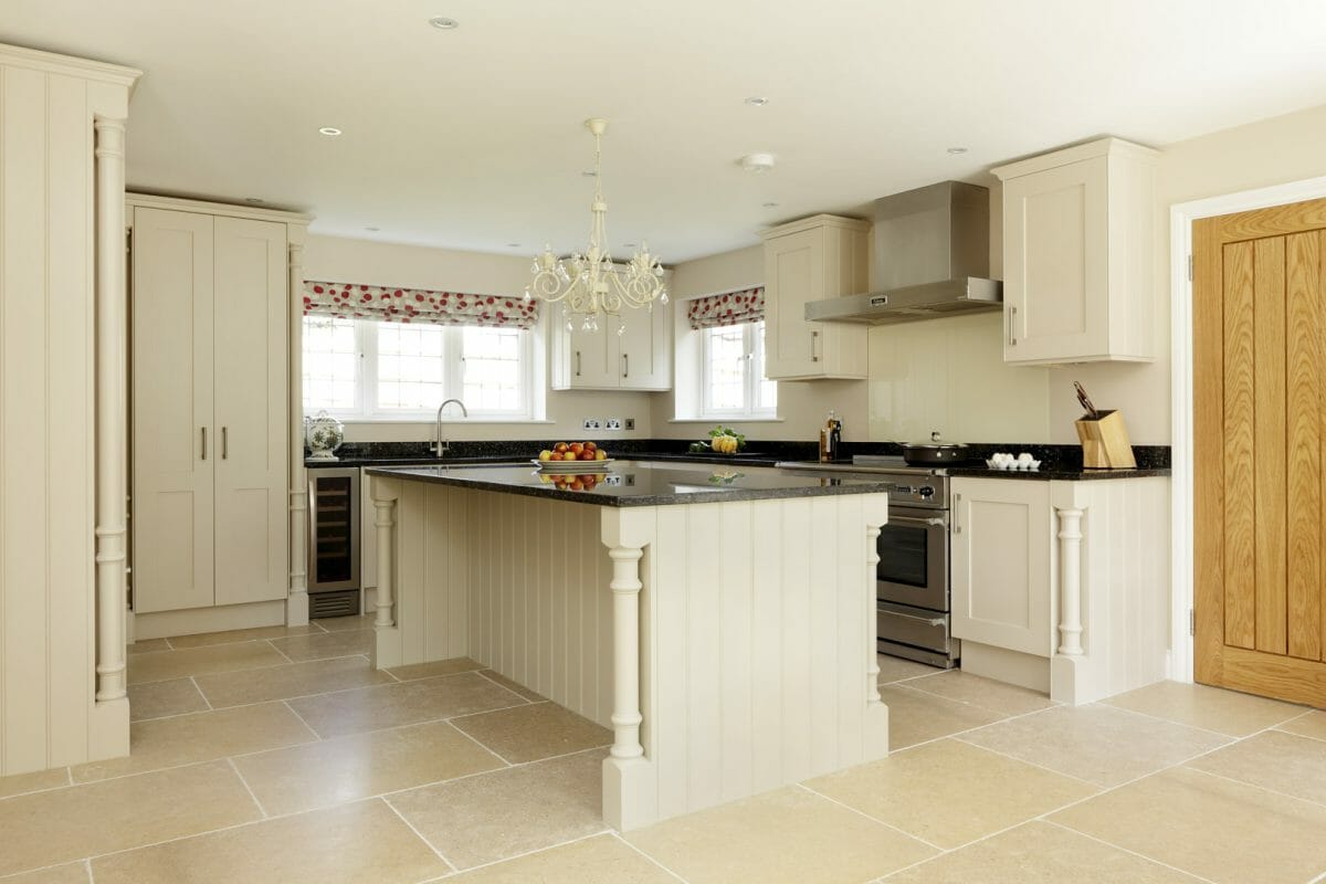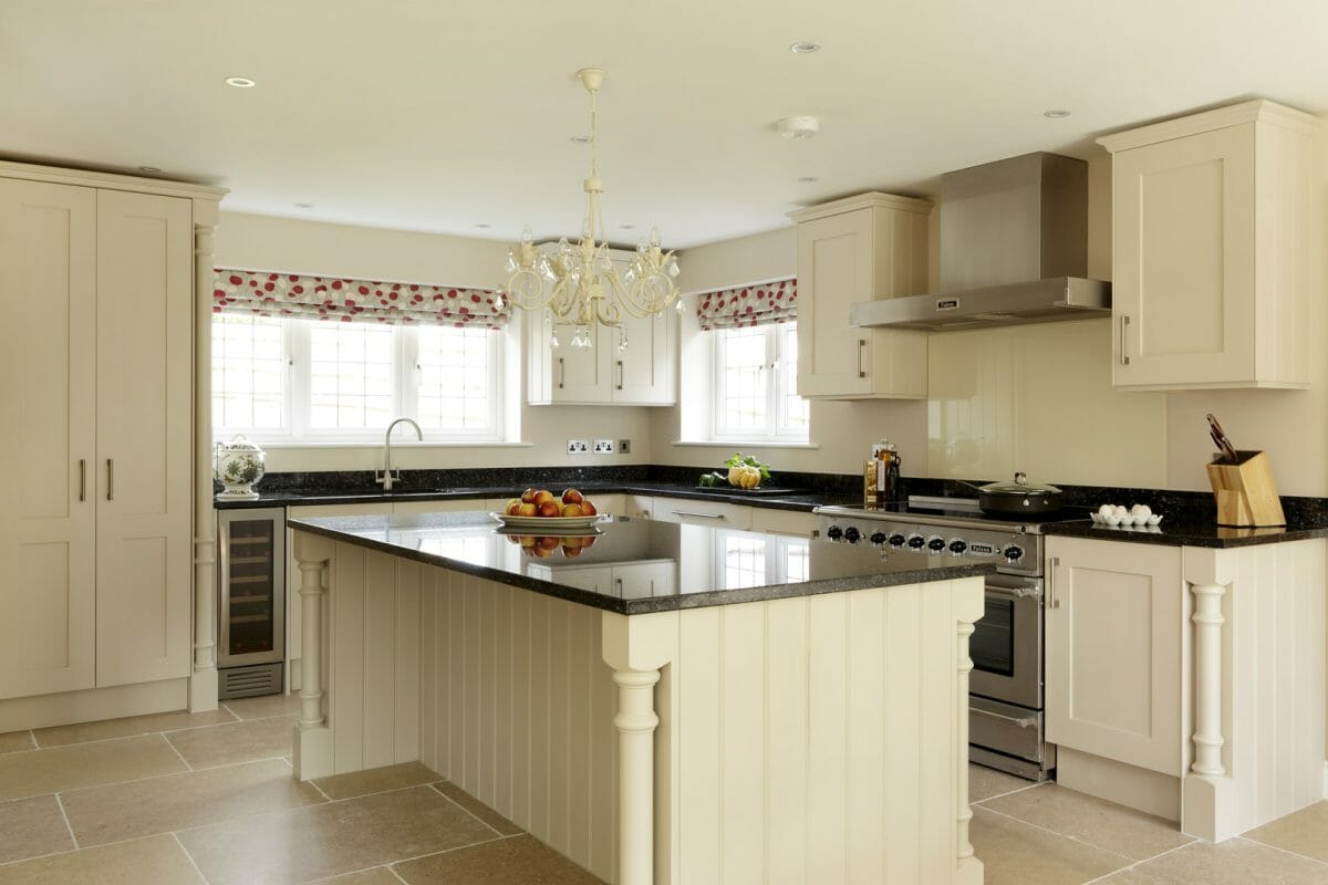 This hand painted bespoke kitchen with surface-hung doors combines the traditional with modern sitting comfortably in the new build. Tongue and groove end panels with cornice and turning in solid wood taking a simple shaker style concept and giving it a bit of luxury. Black granite worktops finish off the contemporary feel to this traditional kitchen.
