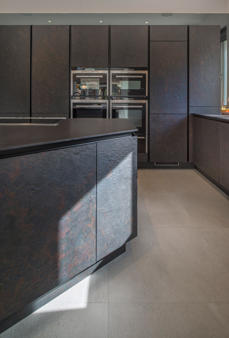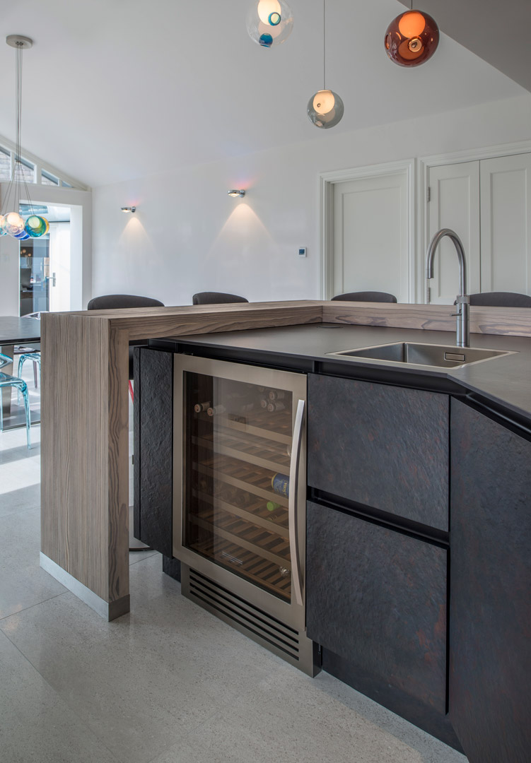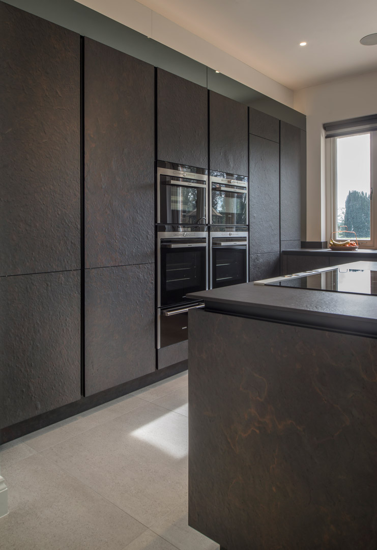 The utility needed to be light, bright and completely different from the slate-fronted units of the kitchen. Here we have used cashmere-coloured doors that go perfectly with the ceramic wood effect floor. The addition of a bespoke and special drying cupboard fulfils the client’s needs for the perfect utility that is hardwearing and functional but also clean and contemporary.