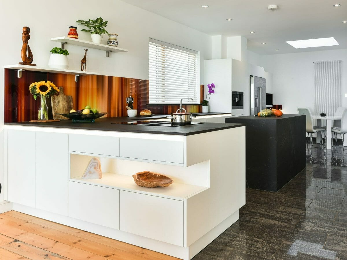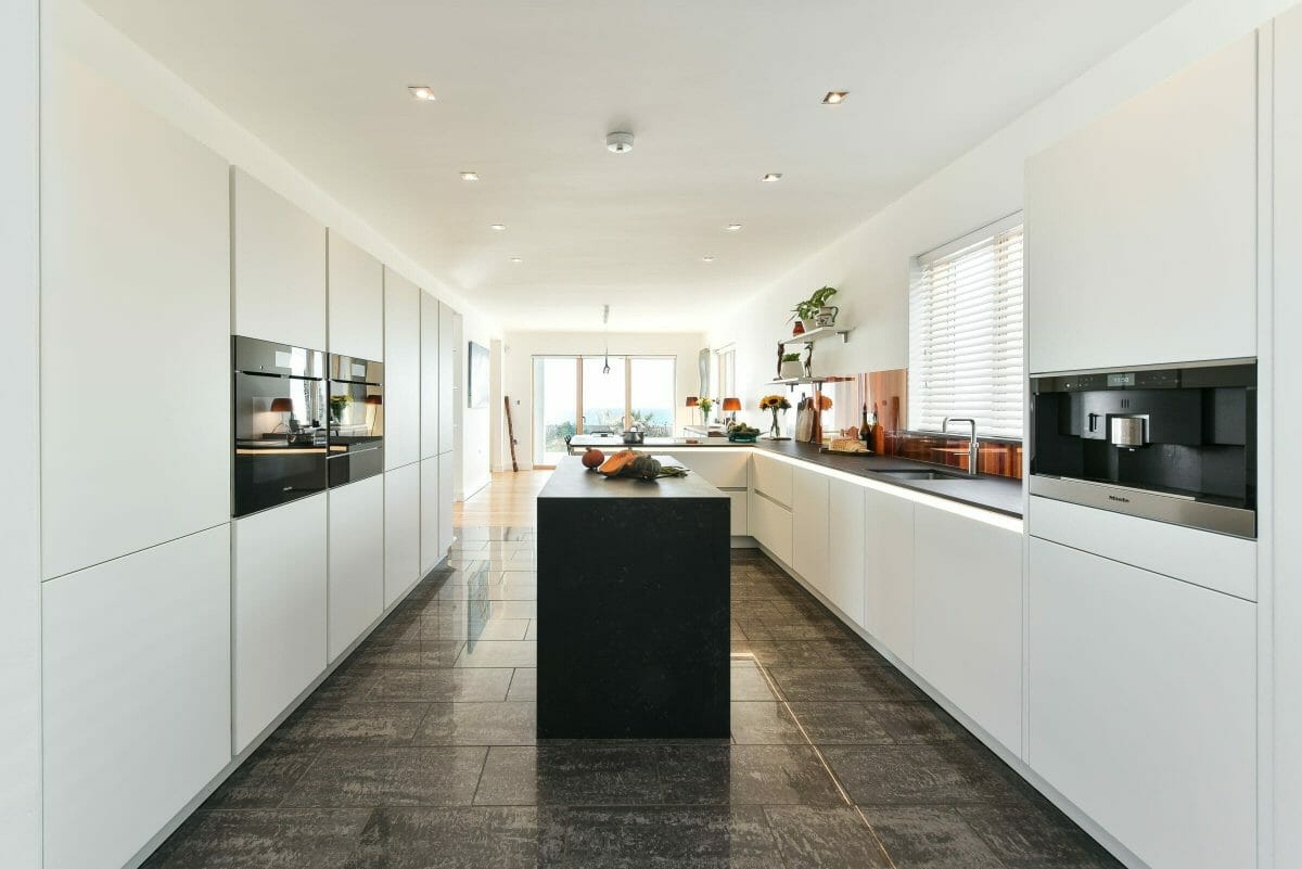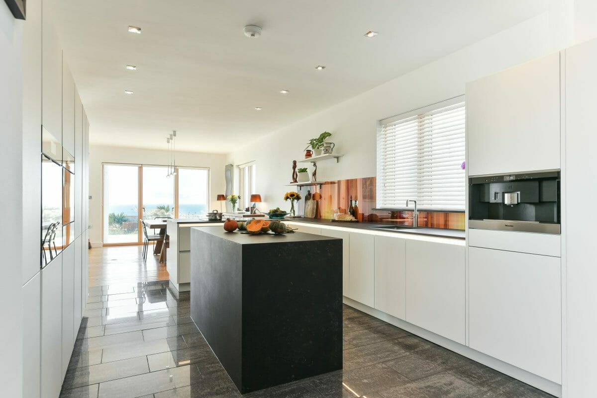 Our clients wanted an open, calm space with distinct areas for cooking, and dining plus a separate zone for the computer and informal breakfast table. Central to all elements of the design were the beautiful seaside views out through the rear doors. To provide sociable cooking, and efficient extraction and ensure the views were not interrupted, we incorporated a Bora hob with integrated downward extraction; a feature the client loves.