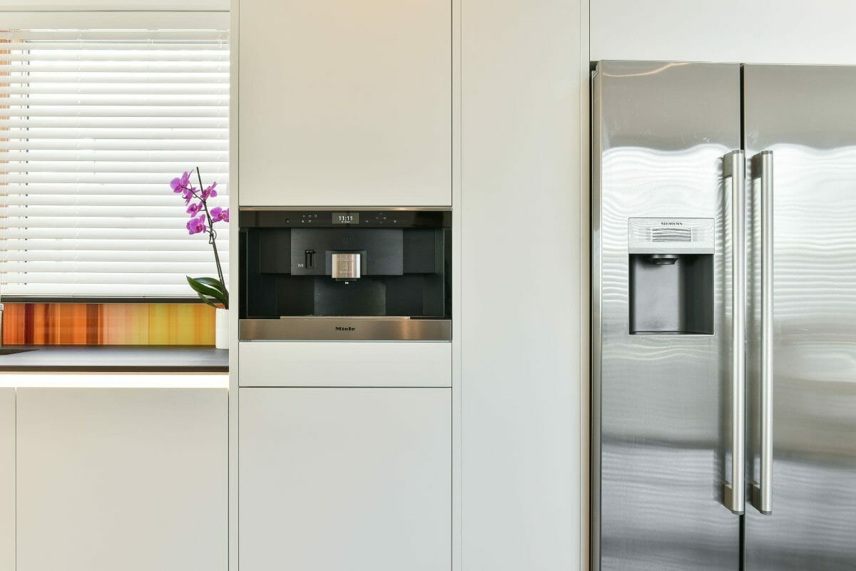 This luxury German handleless kitchen features a textured lacquered door and Dekton worktops. We maximised these stunning worktops on the island by cladding the top, back and sides in the same material, perfectly mitred together.