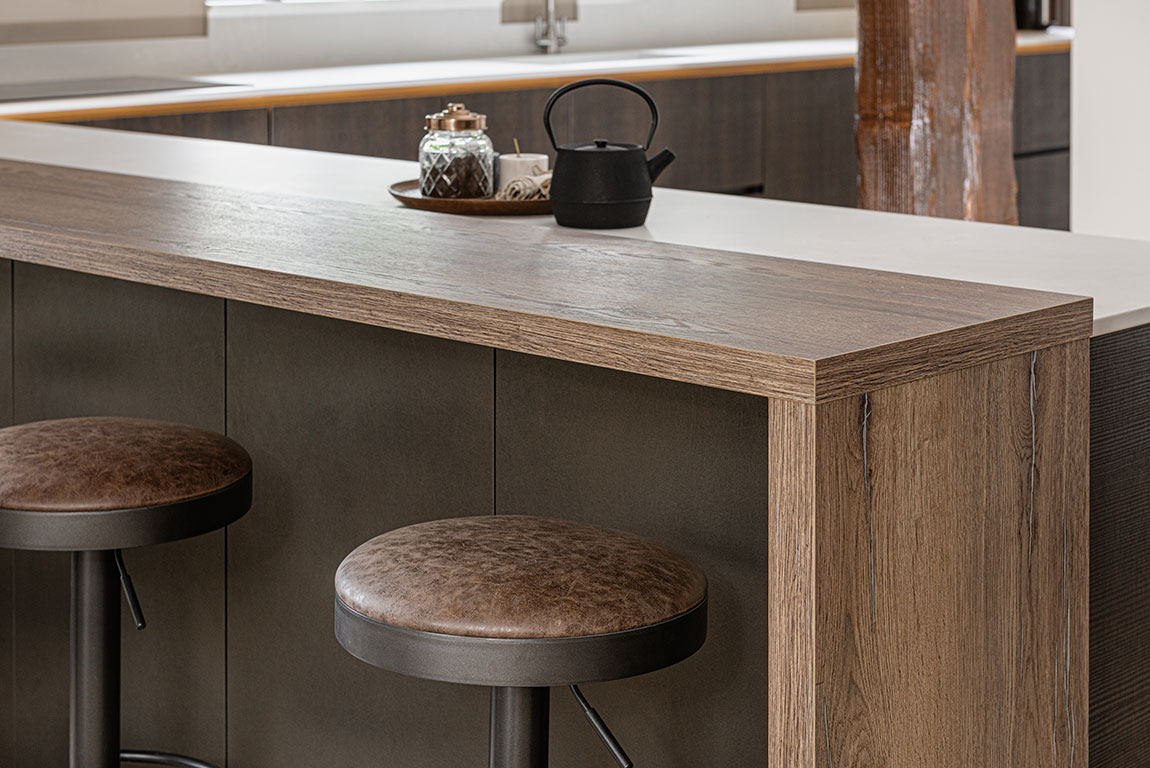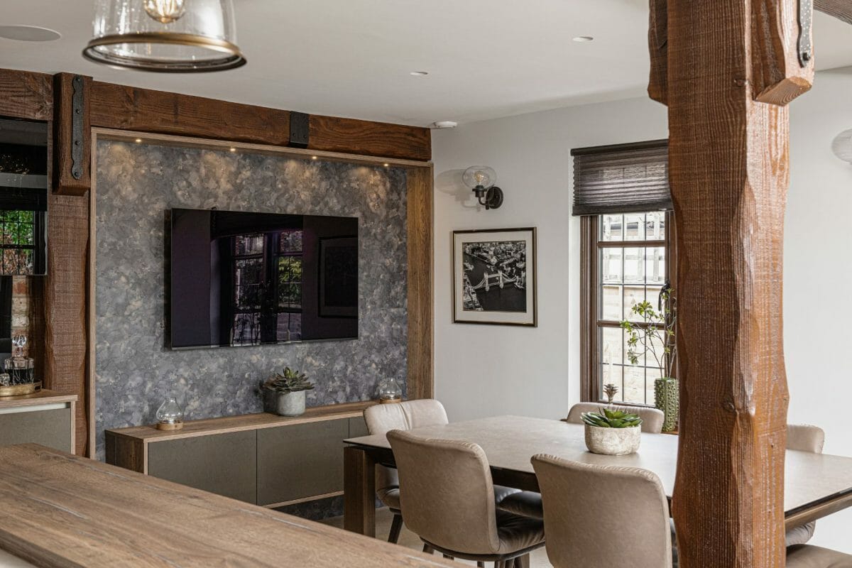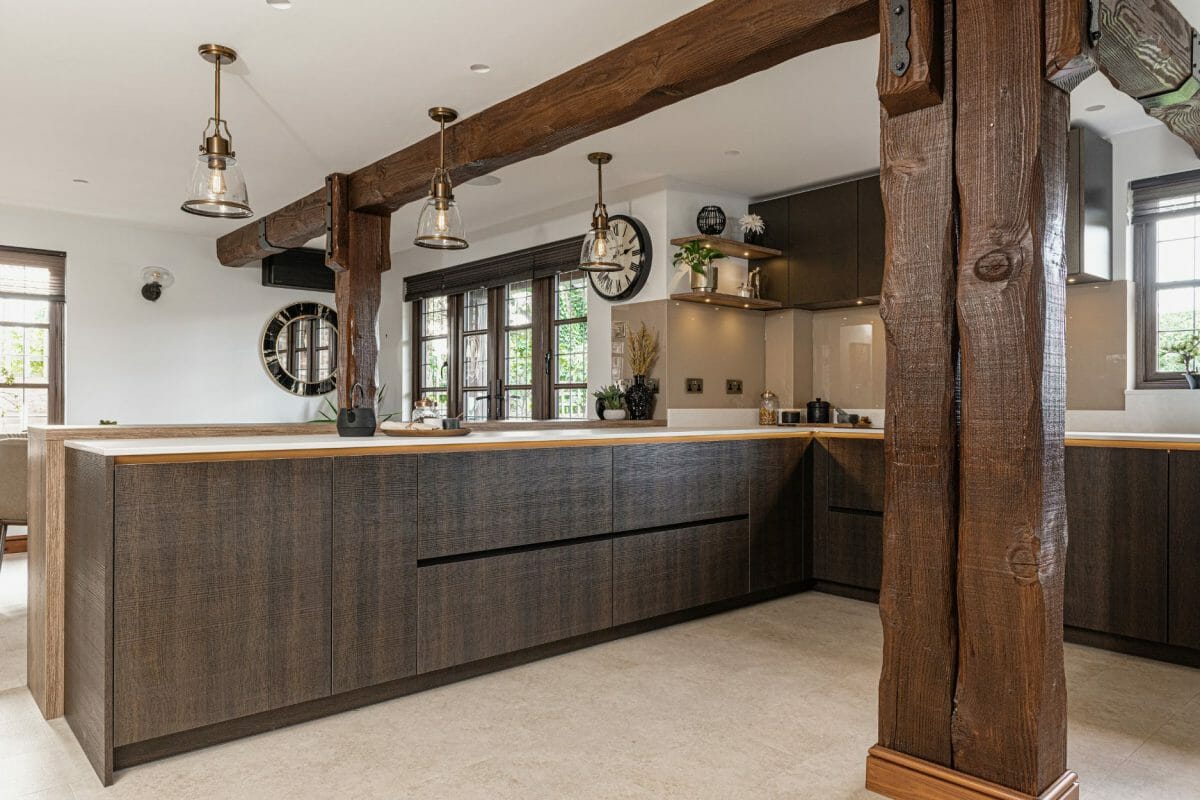 The clever design was key in this kitchen due to the unusual shape spaces, the wooden feature beams, and the need for multiple uses in one room. We created a functional main kitchen area with break-away bar, TV and tall storage zones to maximise the space and flow of the room. The style here is bold and dramatic, as the client wanted a scheme full of different materials and unique finishes, a modern contrast against the traditional oak beams, we achieved this by combining wire-rubbed gold, cross-sawn oak and white cabinetry.