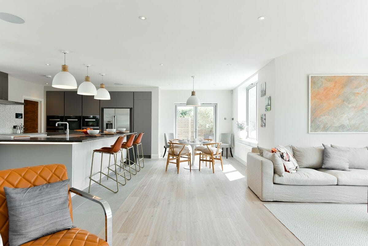 This client approached us to help design a full lower-floor renovation. After drawing up a design that knocked through multiple rooms; the result was a dramatic open-plan space, utilising the grandeur of the property and drawing light from all sides. The client’s brief was to create a ‘wow’ kitchen that complimented the property by using high-end lacquered cabinetry and Miele appliances.
