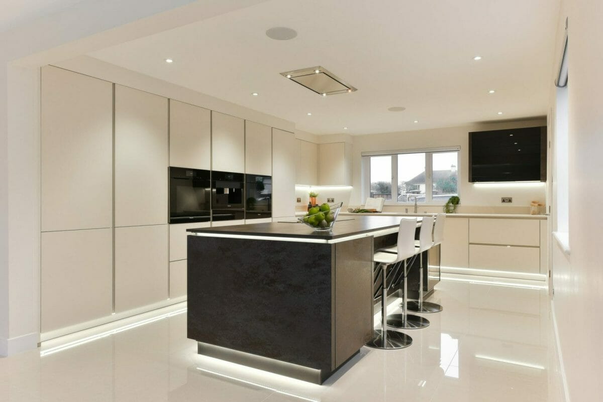 The high gloss floor tiles then reflect back the accent plinth and worktop lighting making the kitchen appear to float. A ceiling extractor helps to keep sightlines clear of obstructions, whilst the modern black glass appliances, plenty of storage and boiling water Quooker tap all also add maximum function whilst keeping the aesthetics pure and clean.