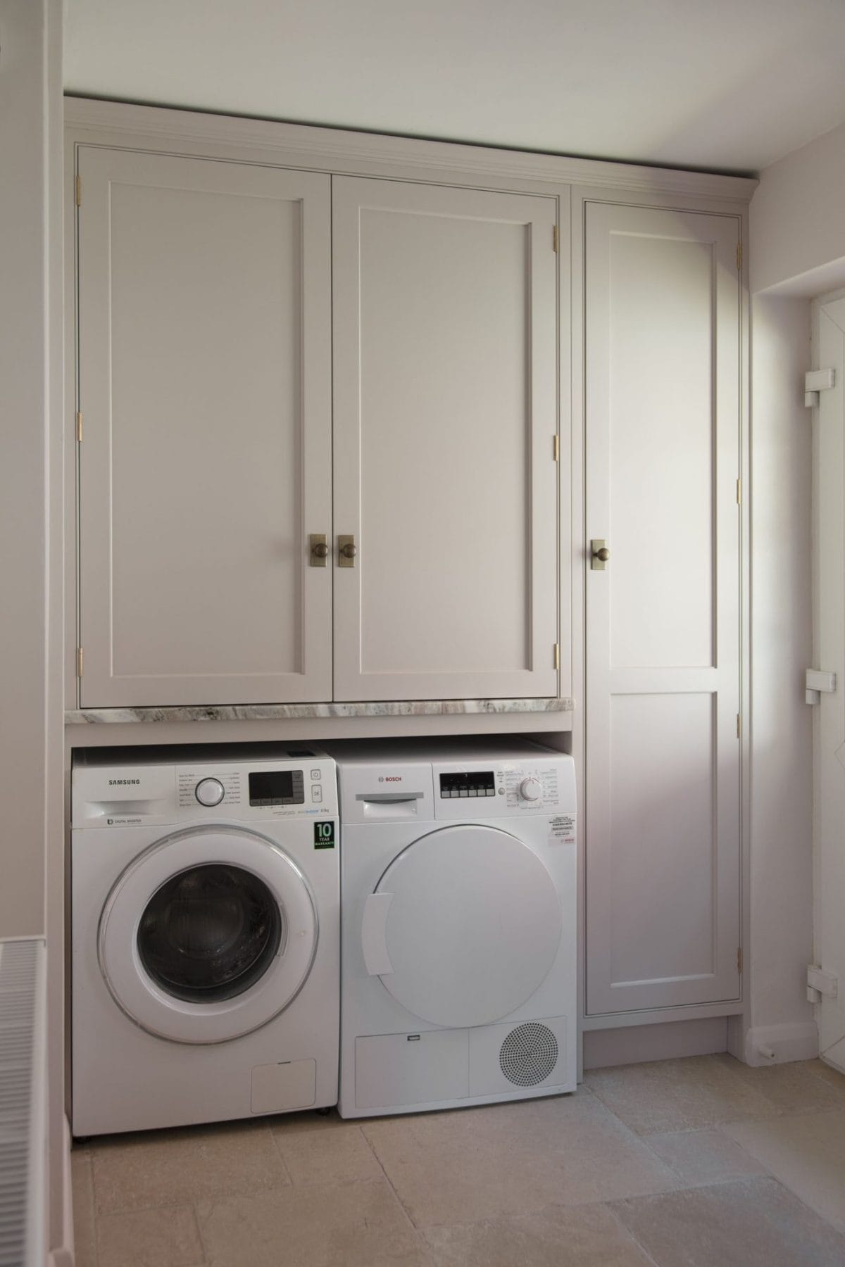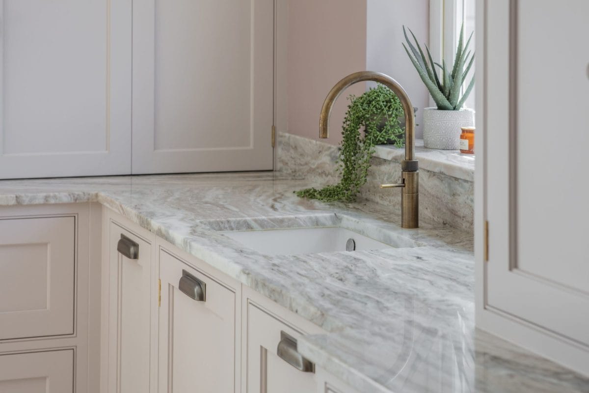 But the crowning glory of this family kitchen must be the exquisite Terra Bianca hard marble wortkops and splashback. The natural patterns and colours beautifully compliment the hand painted in-frame Shaker cabinetry. Pink is the new neutral!