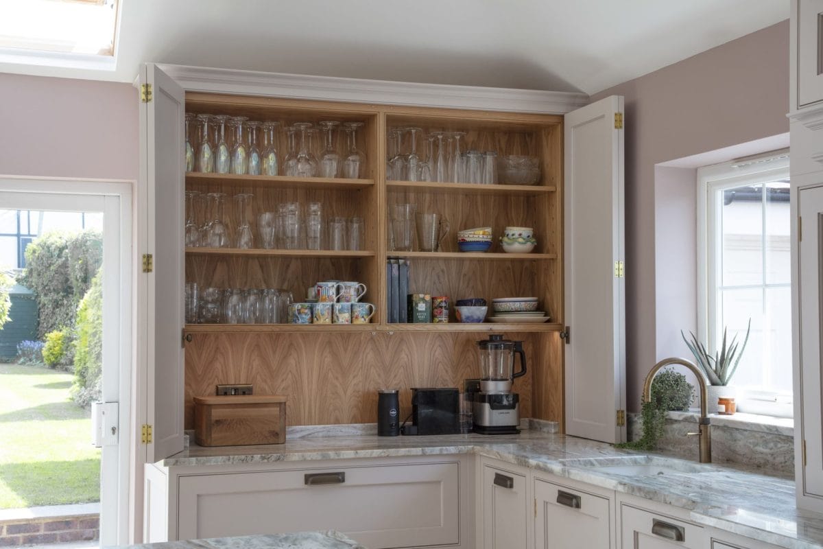 Shades of pink and natural stone layer to create warmth and softness in this calm and harmonious kitchen design. Frequently housing generations of family this space needed to be practical and welcoming. A bespoke canopy surrounds the freestanding range while the island provides prep space and storage opposite. A large bi-folding worktop dresser provide great secret storage for all their glassware, teas, coffees, and worktop mounted appliances: easy to use and then easy to hide away afterwards!