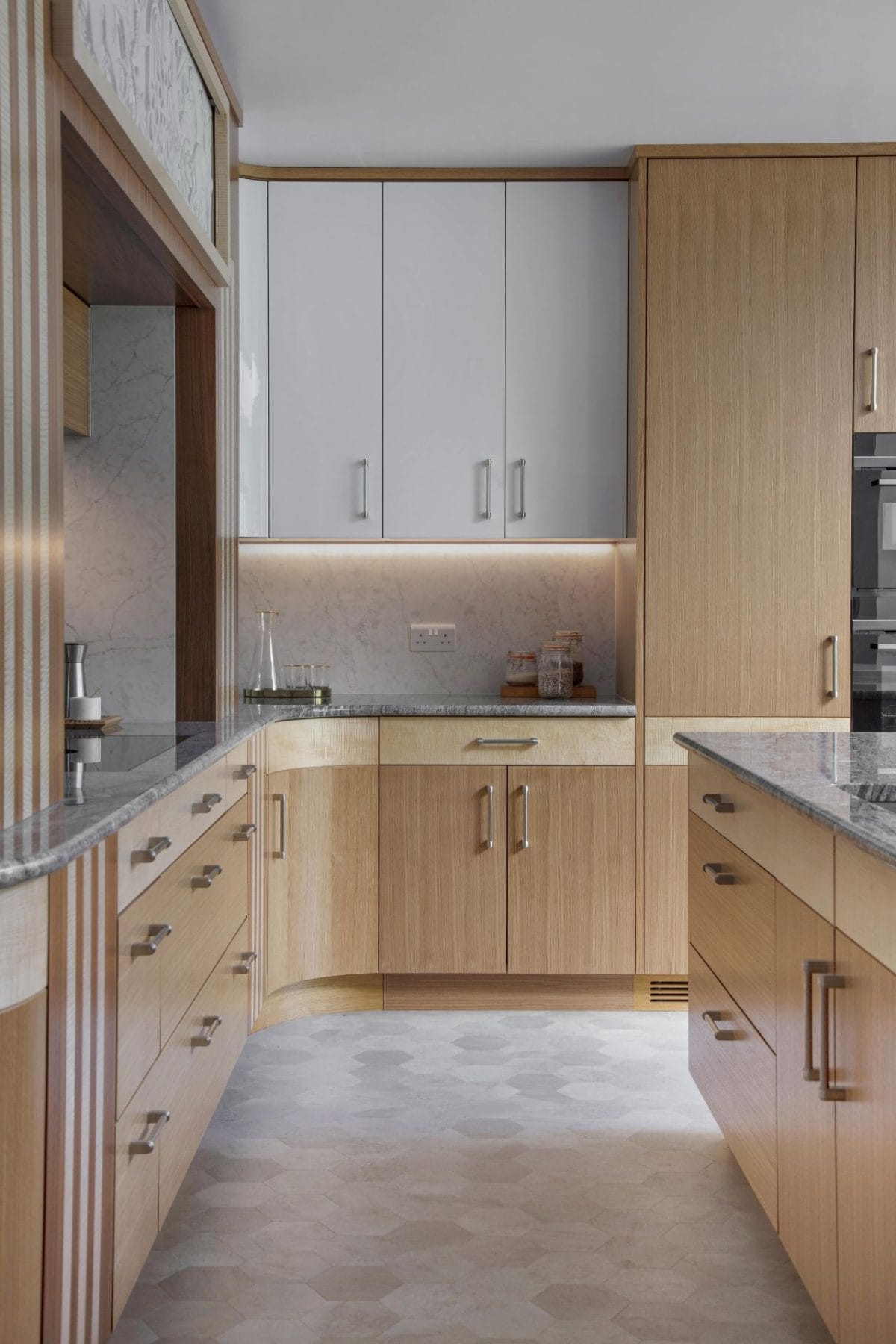 Shortlisted for the KBB review Design Awards 2024 ‘Best Kitchen’; this stunning Art Deco scheme was 12 years in the making for our clients who spent their time trying to track down the perfect company to provide the kitchen for the painstaking restoration of their period property. Our brief was to create a unique design of hand-built Art Deco style cabinetry, housing the functionality of a modern high-spec kitchen. Burr-walnut, heavily figured sycamore and oak are combined along with lacquered white units to create a luxury palette true to the era.