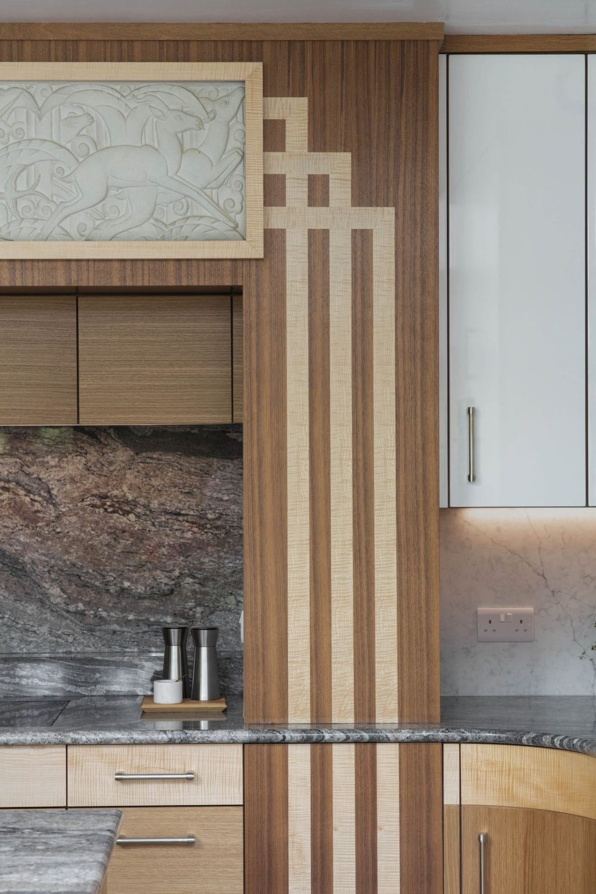The true pièce-de-résistance of this space is the feature canopy which clads the existing fireplace, with its sycamore inlay design and mounted stone frieze. A real emblem of Art Deco design which then houses concealed storage and a modern Bora vented hob for the ultimate combination of retro design and modern functionality.