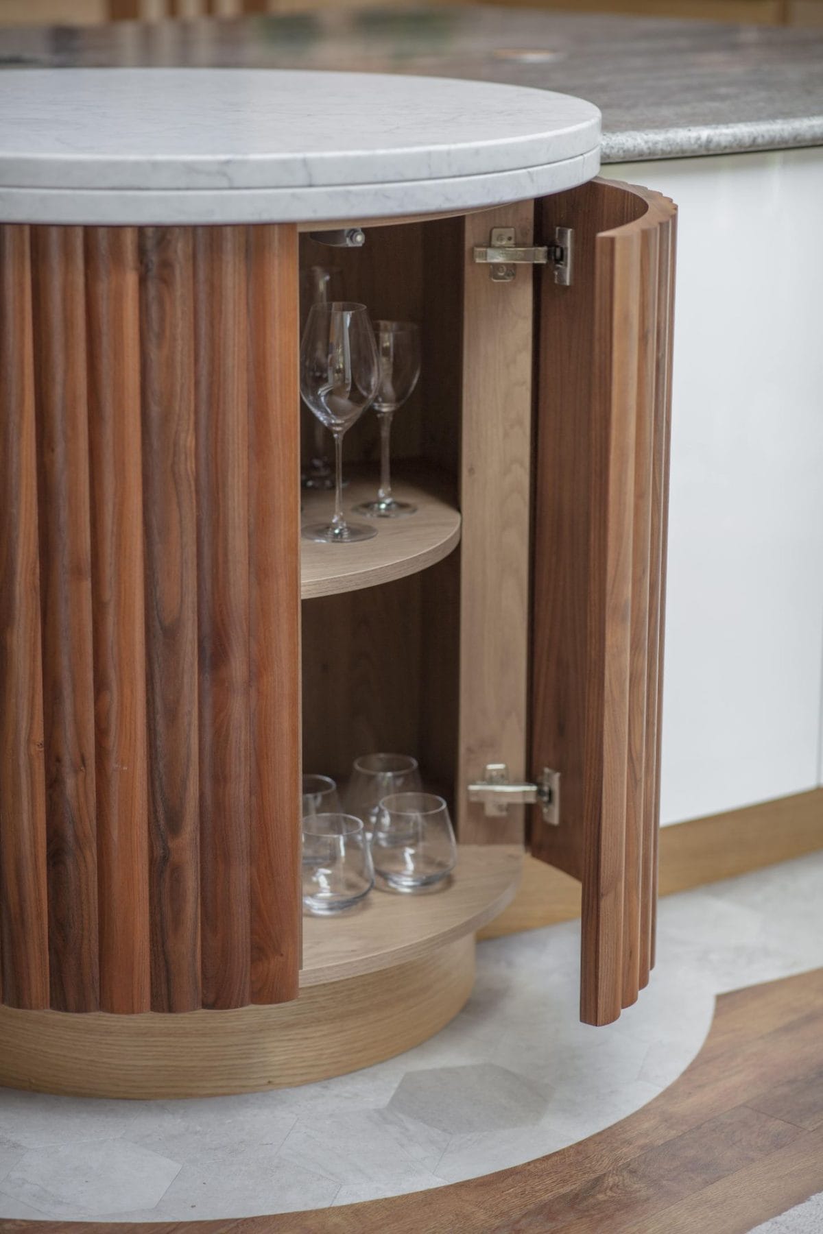 Classy curves, drawer line units with contrasting veneers, and 1920s styling are key to the look. A completely bespoke island with a sweeping a-symmetric curve is built to suit the shape of the room with its central pillar and to maximise storage within. Other clever storage solutions include: a notched larder containing pullouts and internal shelves to concealing a hidden step in the wall, hidden spice racks within the canopy, and the island’s feature ribbed-walnut round unit to house the couple’s cocktail and wine glasses adjacent to the dining area.