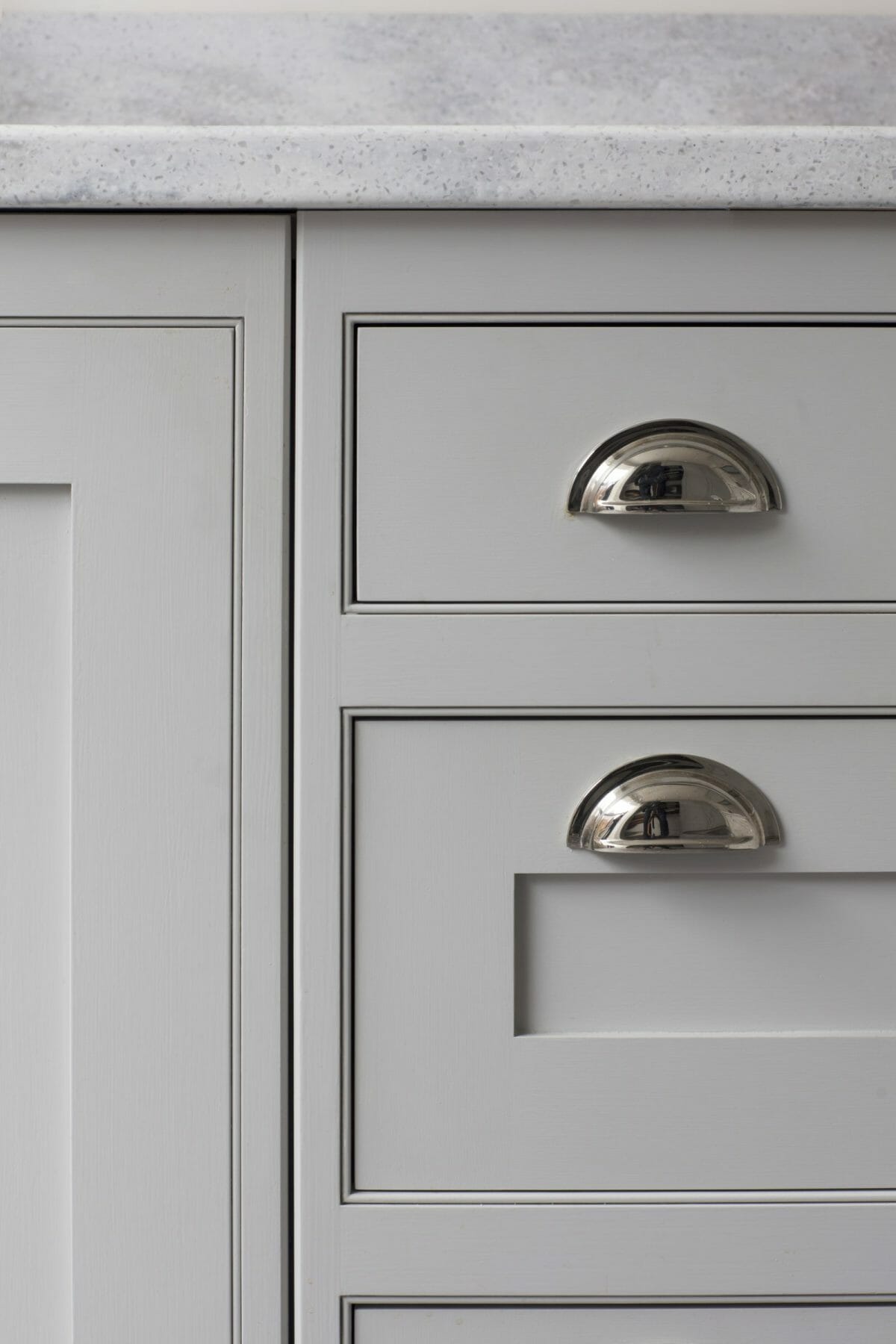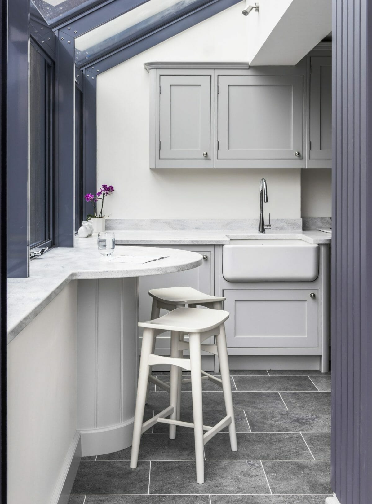 Here we use a painted bespoke in-frame shaker in Pavilion Grey to create simple timeless elegance. We worked with the unusual space to create a solution tailored to the client’s needs and wish list. In this design we use bespoke wall units to wrap around a change in ceiling height and work with a step in the wall depth, to discretely hide plumbing