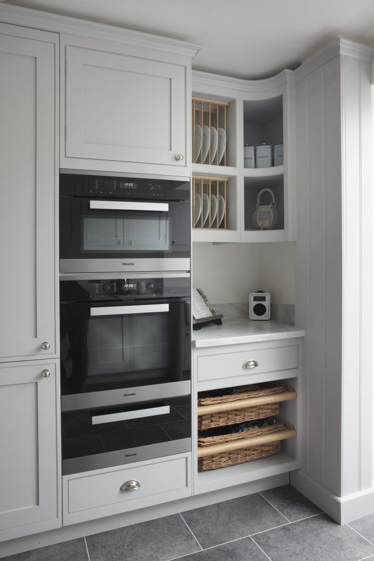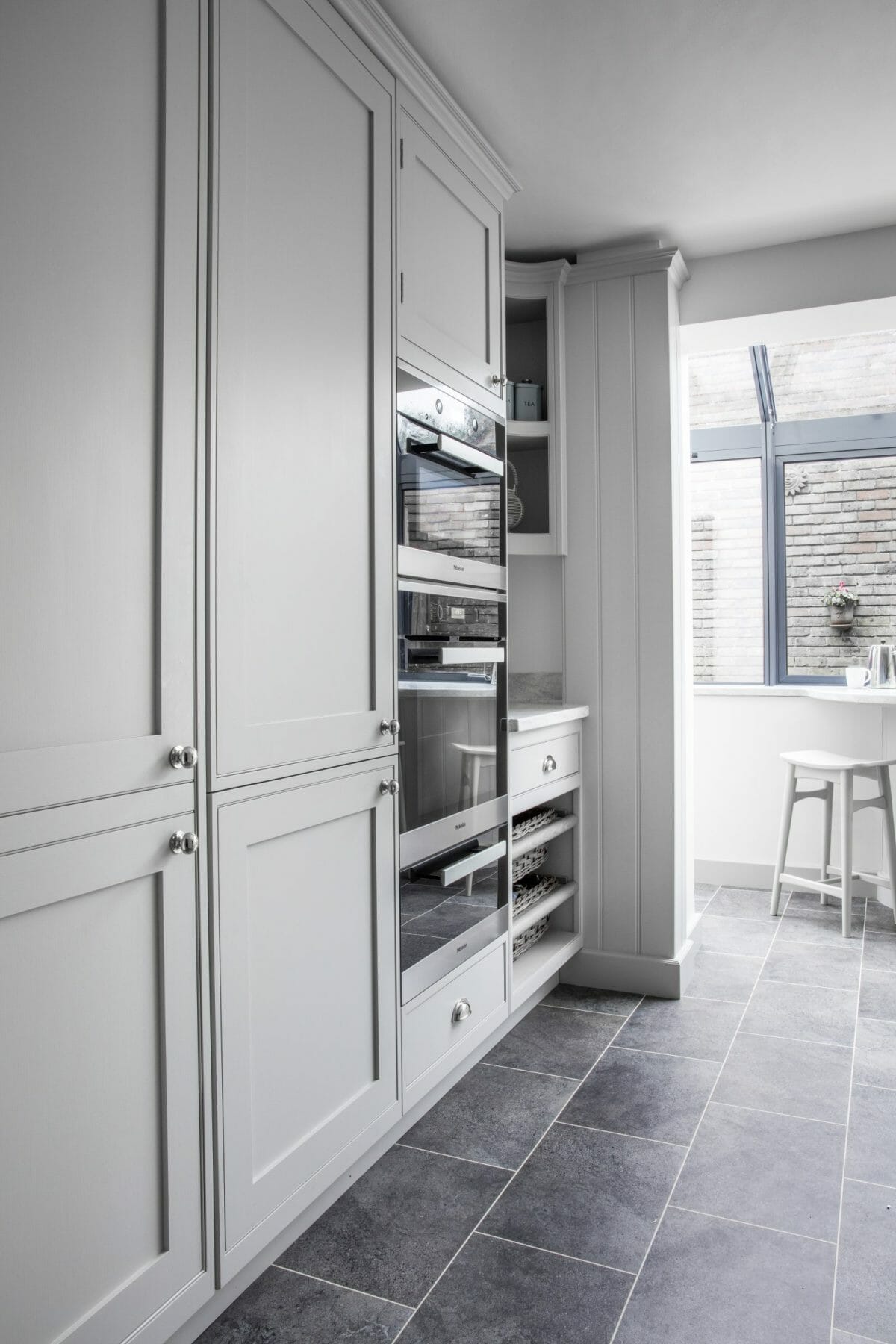 These traditional elements coupled with the contemporary grey palate and clean lines of the shaker cabinetry create a timeless appeal. This kitchen features a butler sink, Corian worktops and Miele appliances.