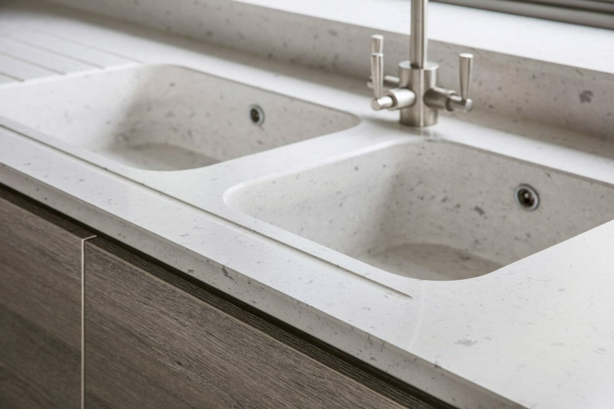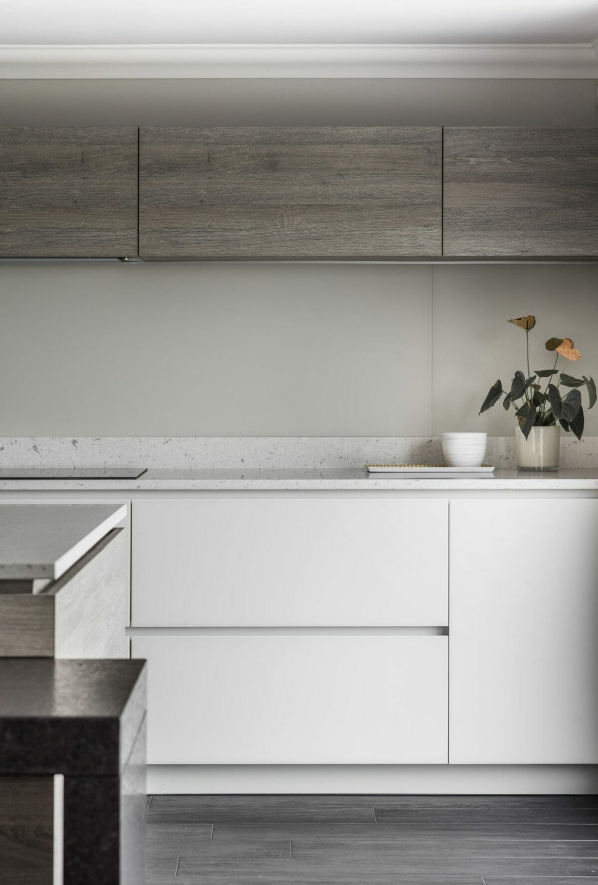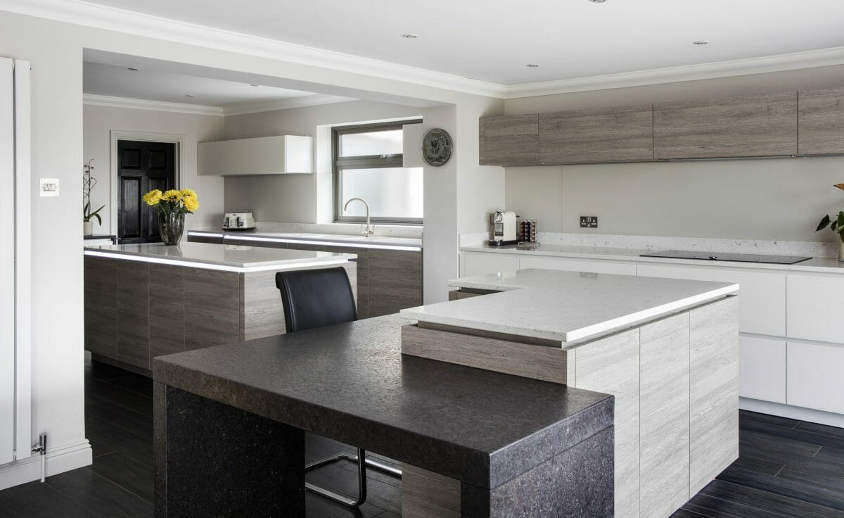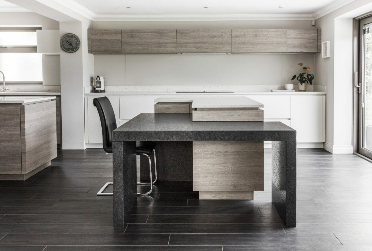 These clients are keen cooks for whom the flow of the kitchen was key. To maximise the work surface and create separate prep areas we worked with the client to create this unique double island design. The lower Sensa granite seating area provides space to entertain and soak up the beautiful views from the near-side island, which then leads seamlessly into the family lounge.
