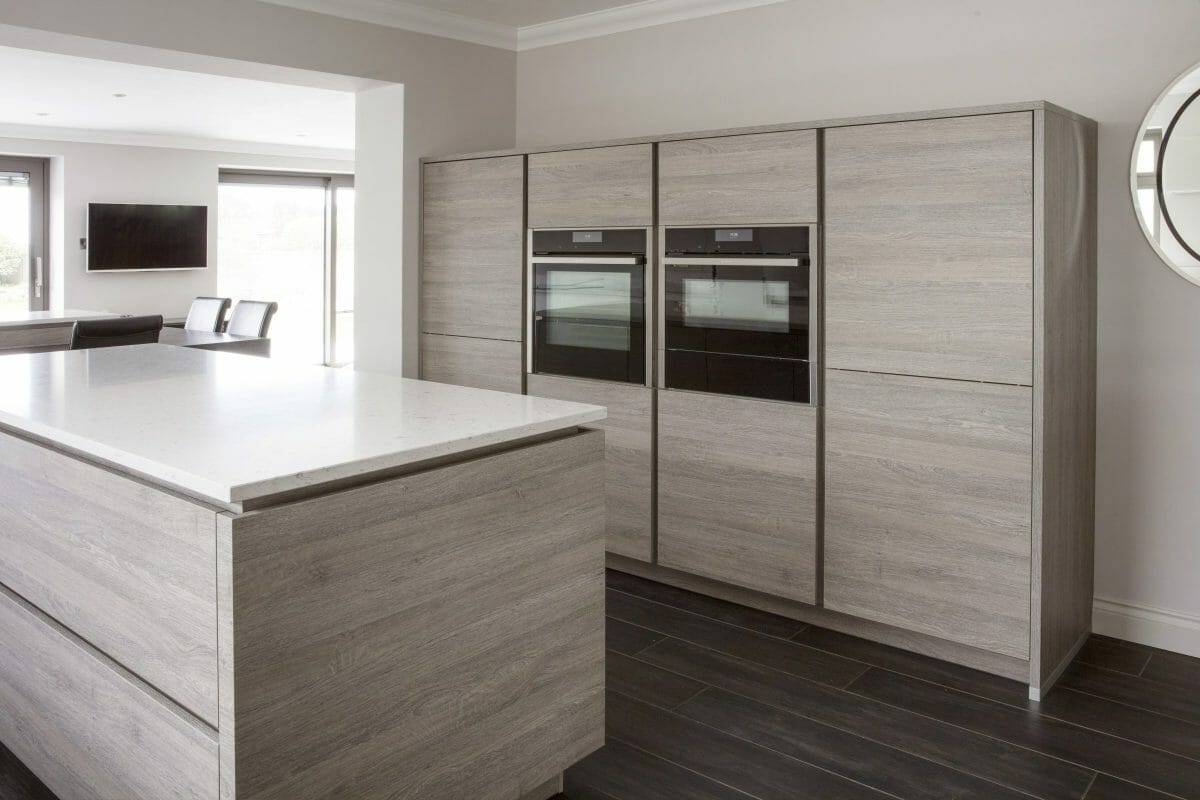 The raised narrow wall units and mid-height appliance towers all serve to create an additional sense of space, whilst the Silestone Bianco Rivers worktop reflects natural light around the room. Neff appliances, the Franke Filter Flow tap and the Silestone Integrity sink sinks all add to the quality high-end functionality of this kitchen.
