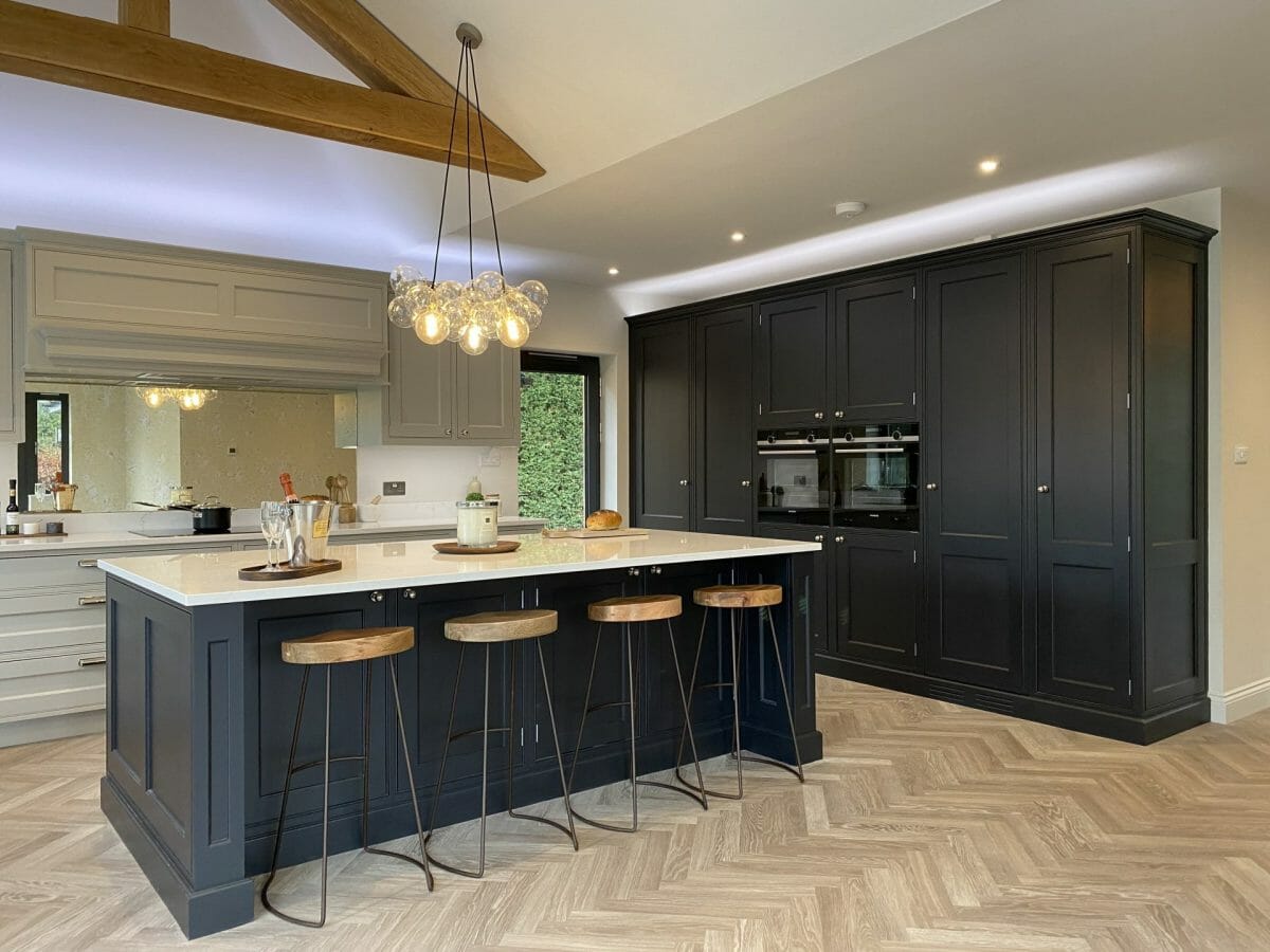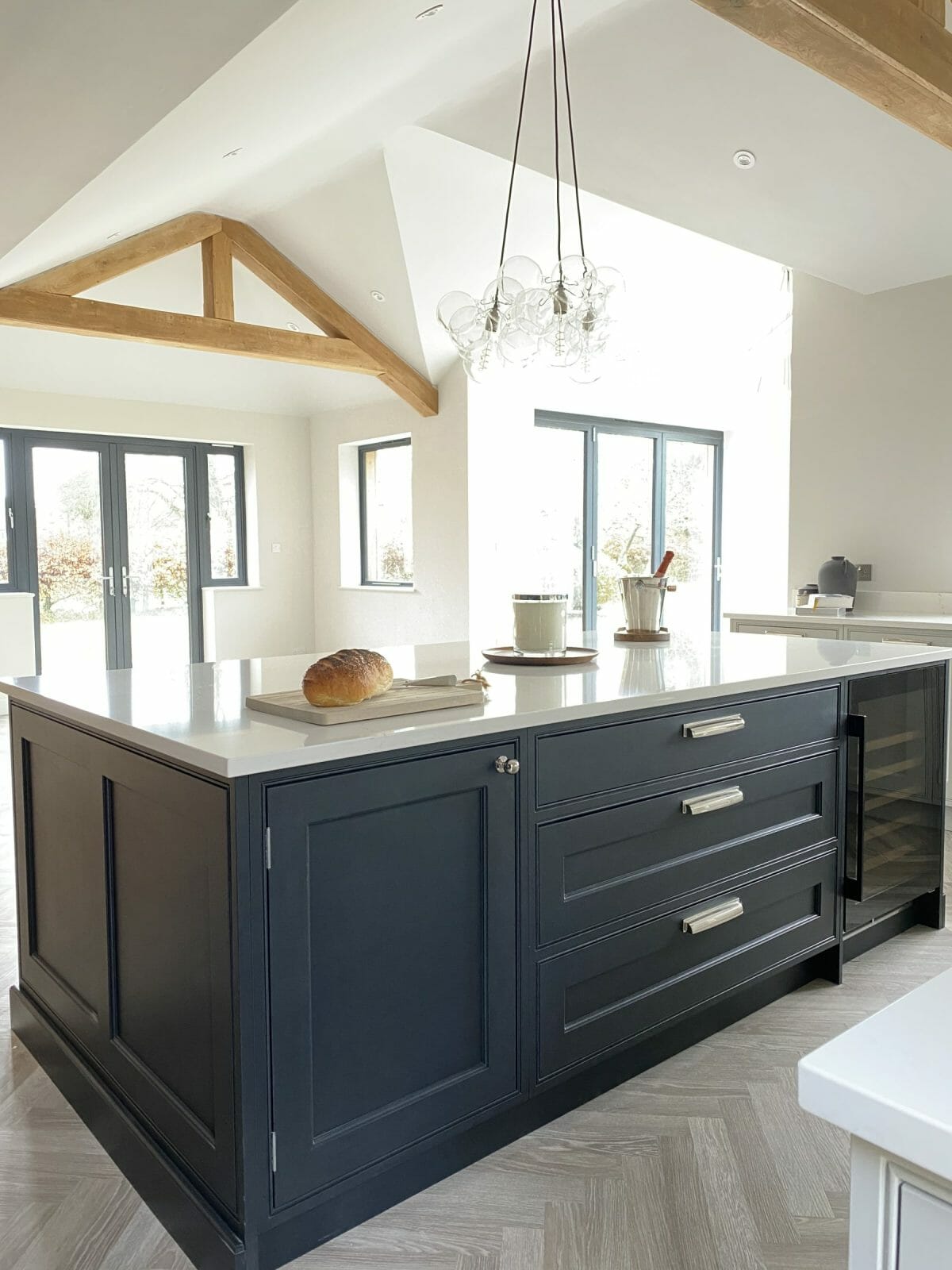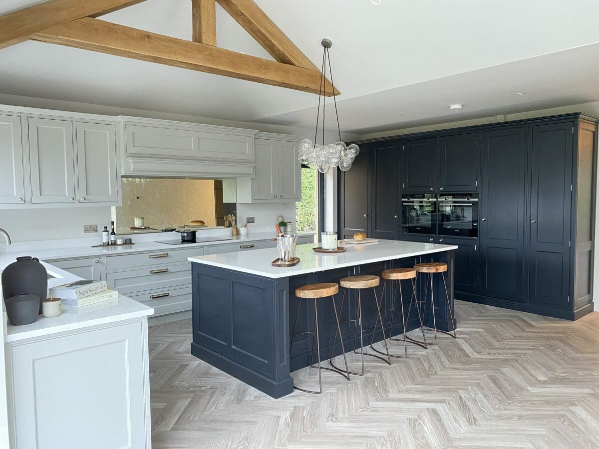 Classic cabinetry and colour palettes epitomise this timeless design. By pairing neutral colours with deep navy, light marble quartz worktops and elegant in-frame shaker units we have created a design which will stand the test of time. The open-plan space is completed with a L-shape layout, tall bank of appliance and storage towers, and a large format island beneath the stunning vaulted ceiling. Herringbone flooring, a large glass cluster pendant and elongated chrome cup handles add the perfect finishing details