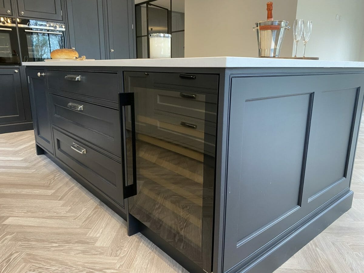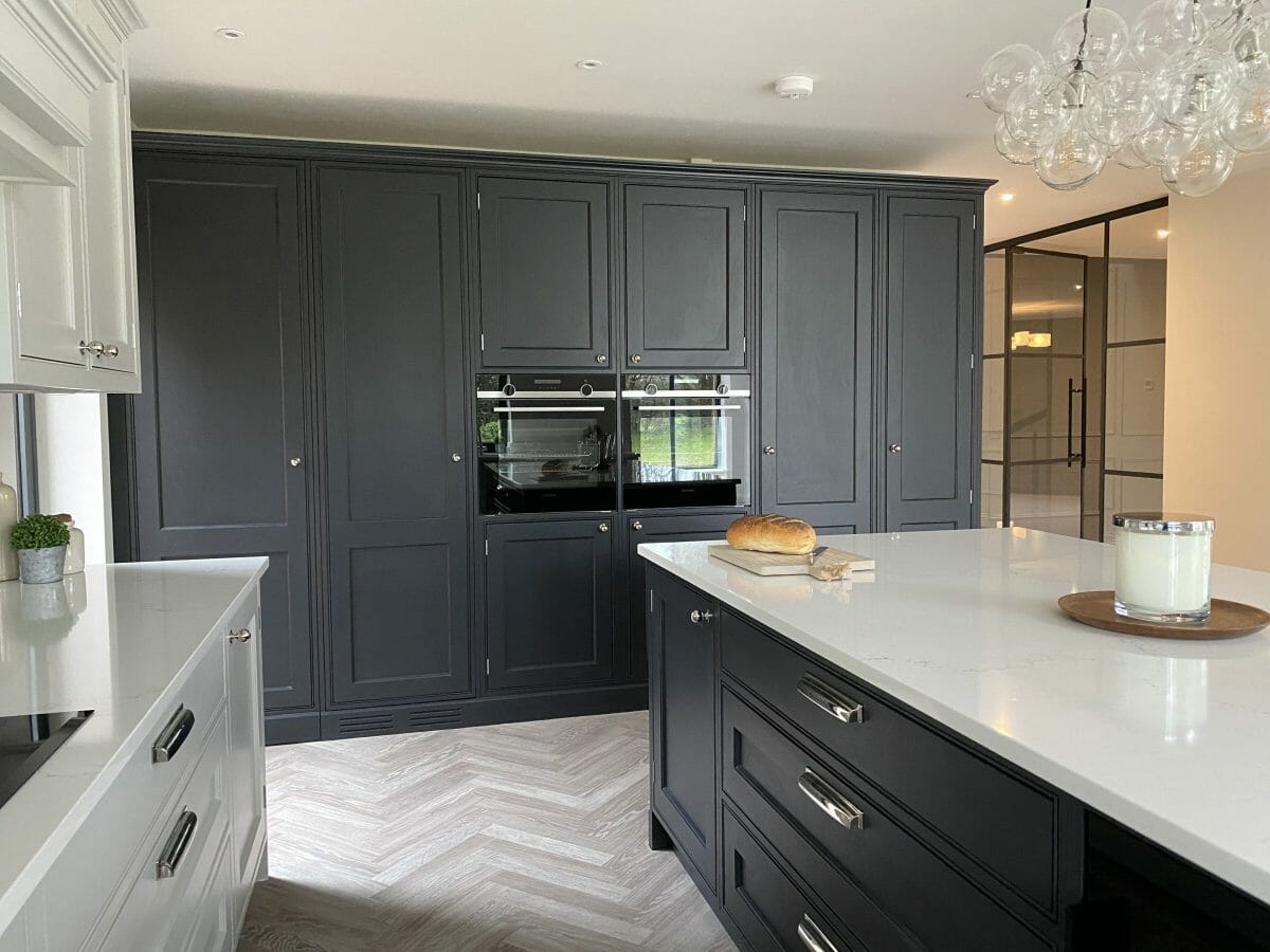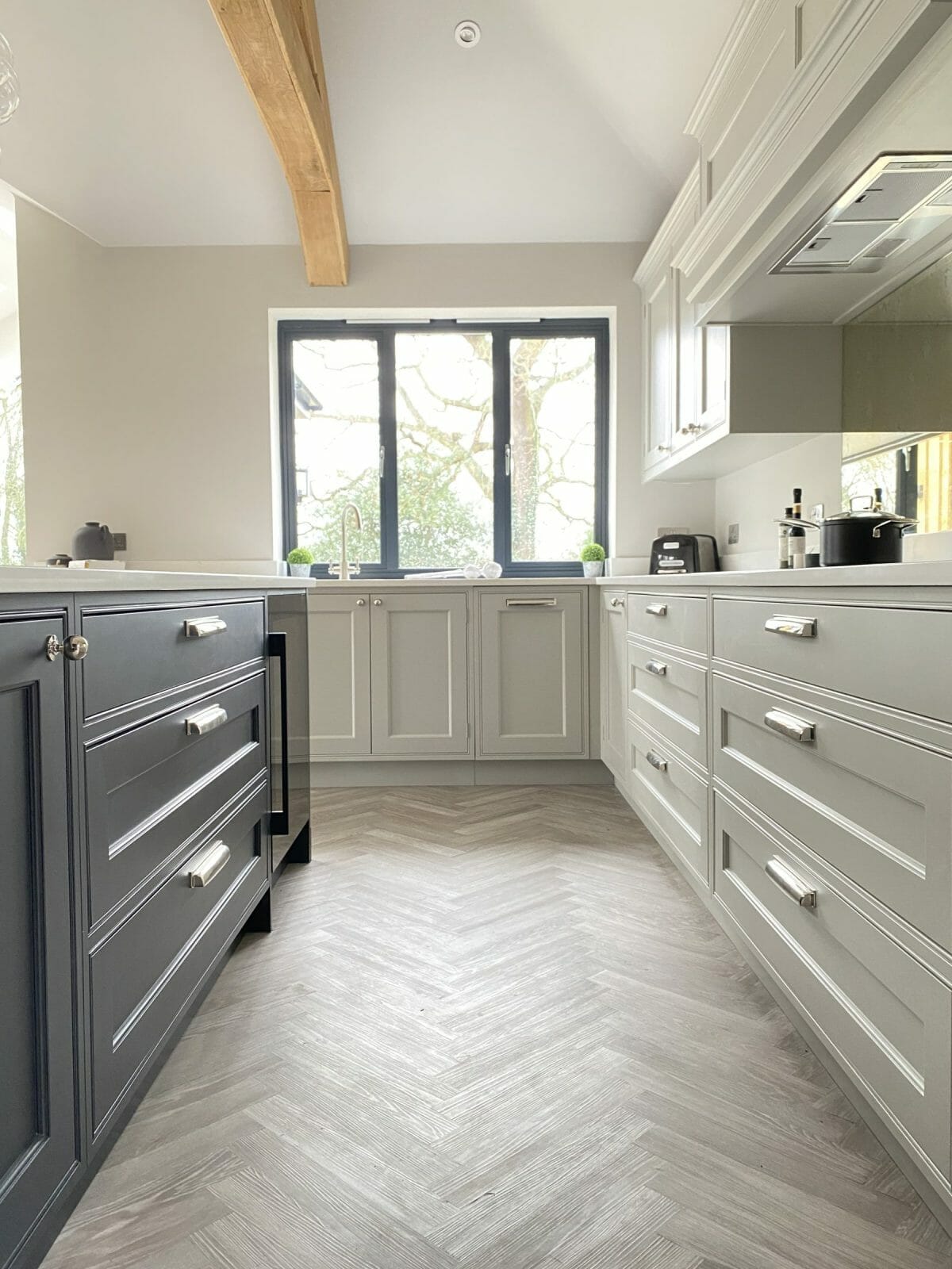 Classic cabinetry and colour palettes epitomise this timeless design. By pairing neutral colours with deep navy, light marble quartz worktops and elegant in-frame shaker units we have created a design which will stand the test of time. The open-plan space is completed with a L-shape layout, tall bank of appliance and storage towers, and a large format island beneath the stunning vaulted ceiling. Herringbone flooring, a large glass cluster pendant and elongated chrome cup handles add the perfect finishing details