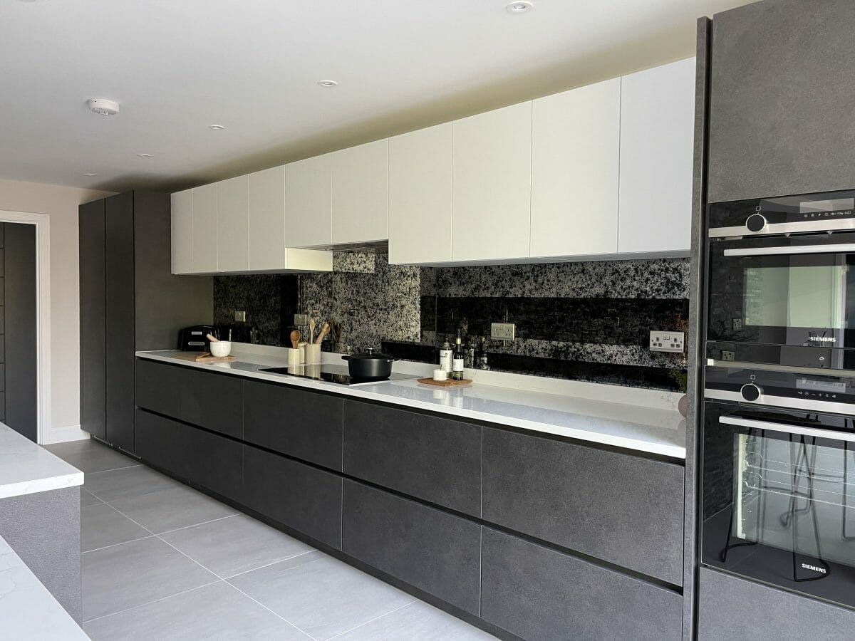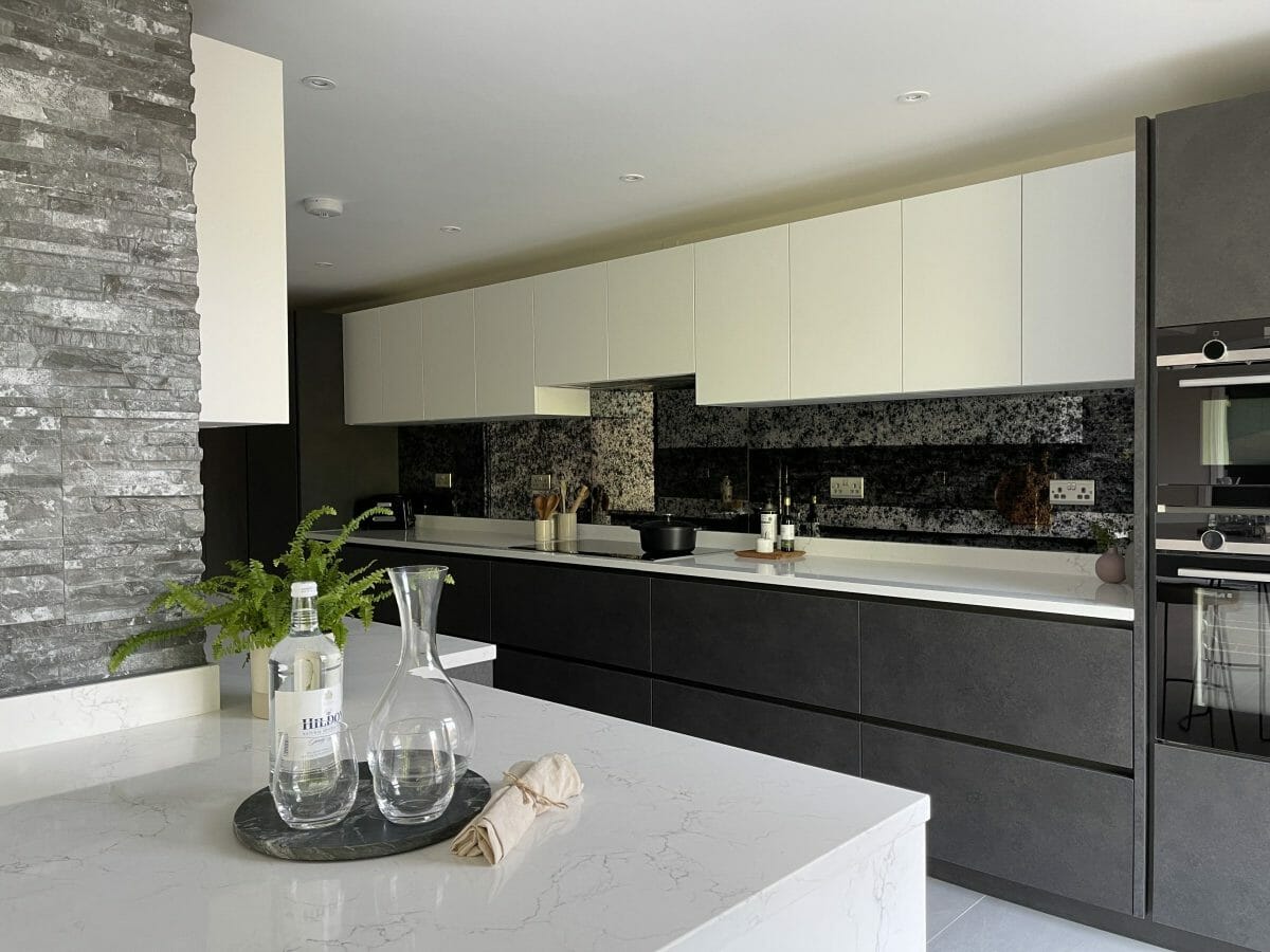 As well as combining textured graphite and finger-print-proof white units, we added interest and texture with the textured split slate and antique mirror on the walls. The floating breakfast bar adds seating with a view, whilst remaining visually open to avoid closing off the space between the two rooms.