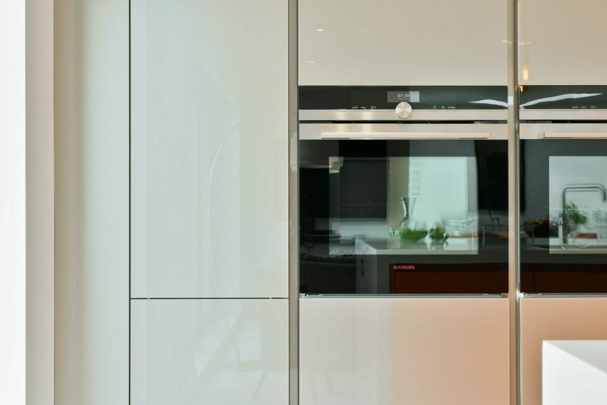 This luxury kitchen showcases champagne ‘Cubanit’ glass cabinetry, coupled with bespoke colour-matched orange gloss lacquer.