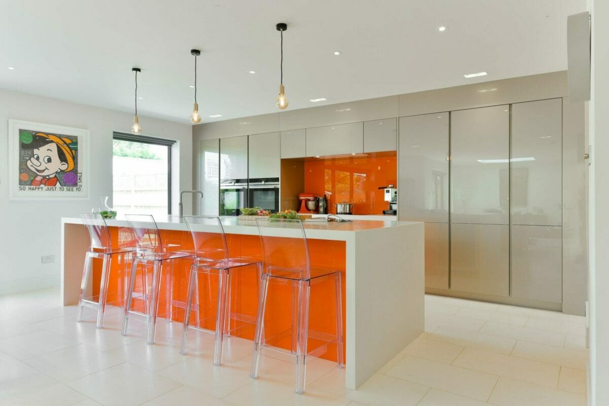 This bold, bright and beautiful space utilises a sleek wall of cabinetry and a large island. Corian worktops with mitred downstands frame the orange island which was matched to the glass splashback to create a striking statement.
